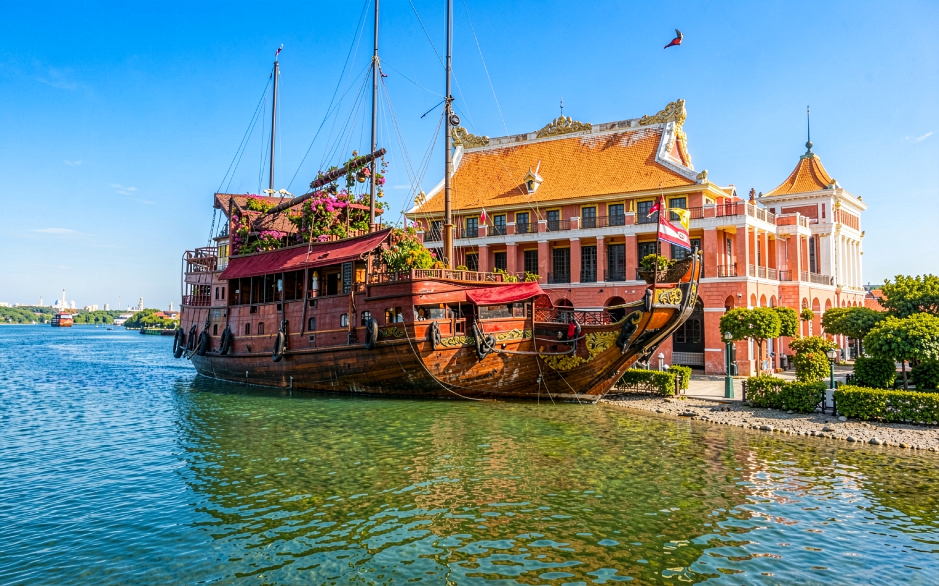 Изображение отличается высокой детализацией текстуры старого дерева на корпусе судна и четкостью кирпичной кладки архитектурного объекта. Освещение создает естественные блики на поверхности воды и мягкие градиенты в небе, подчеркивая объем мачт и элементов декора. На сайте доступен удобный предпросмотр перед скачиванием, чтобы оценить качество цветопередачи на экране.