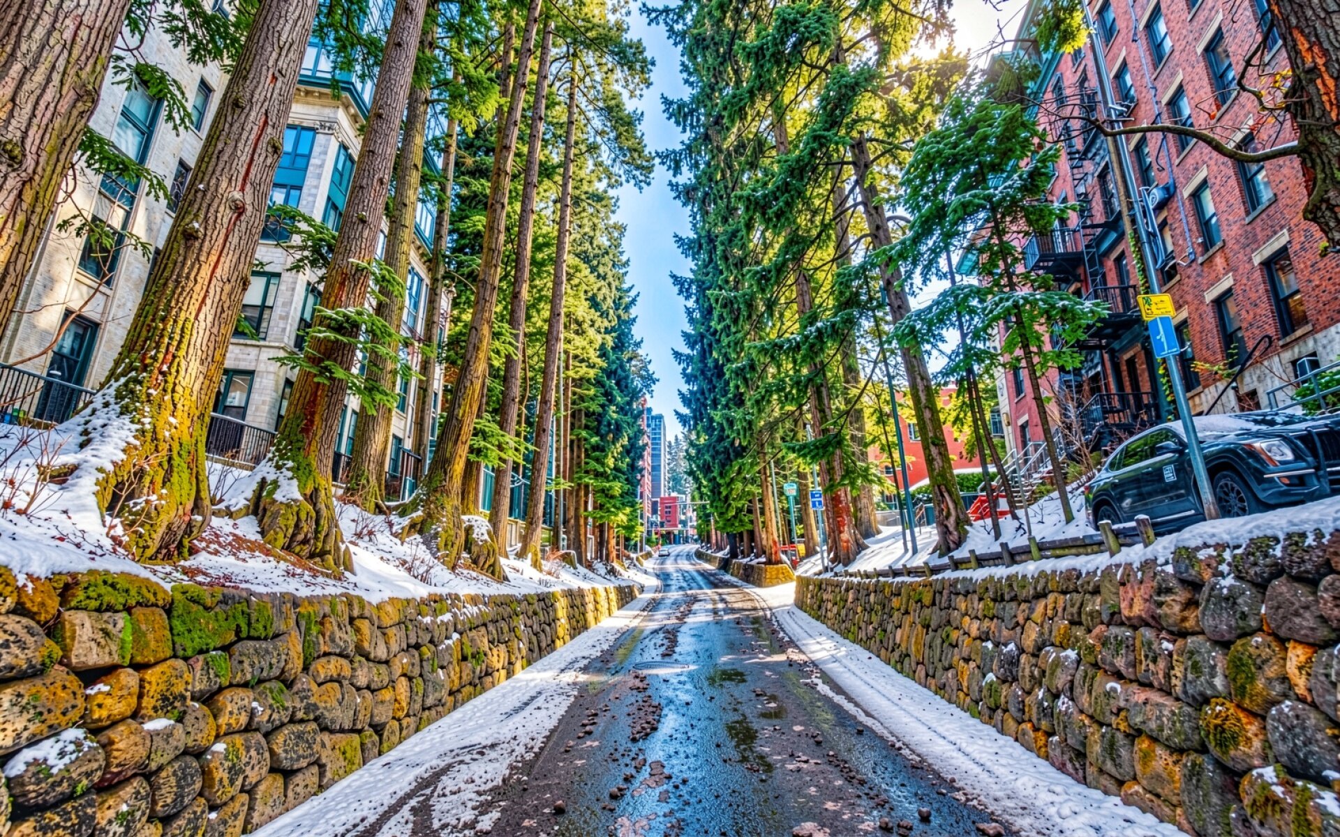 Изображение отличается высокой детализацией коры деревьев и текстуры каменных оград. Освещение создает мягкие градиенты на заснеженных участках, а блики на мокром асфальте подчеркивают глубину перспективы. Контраст между темной хвоей сосен и белым снегом передан без потерь. На сайте реализован удобный предпросмотр перед скачиванием, чтобы оценить качество на экране.
