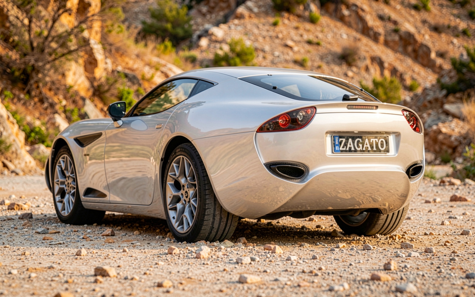Серебристый автомобиль Zagato в горном пейзаже обои