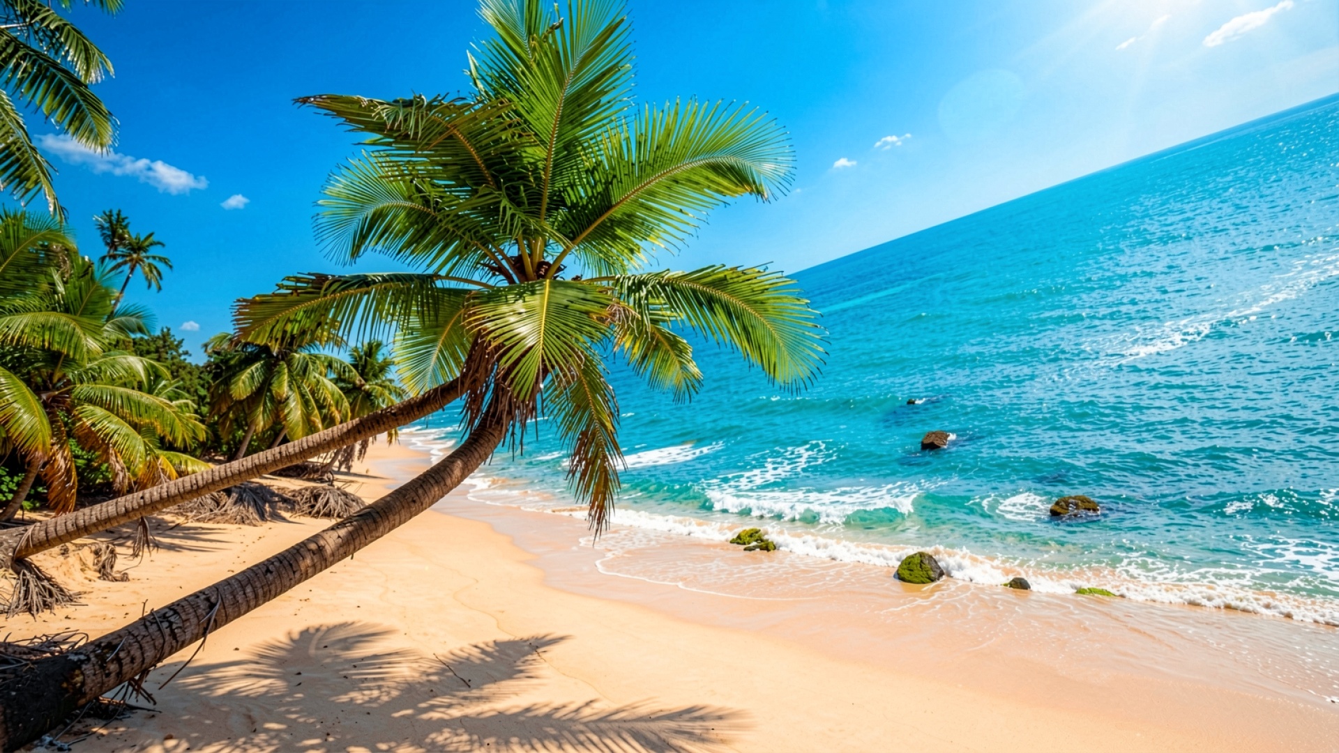 Изображение отличается высокой детализацией текстуры коры стволов и четкостью каждого листа пальмовых ветвей. Освещение имитирует яркий зенитный свет, создавая глубокие контрастные тени на золотистом песке и выразительные блики на поверхности воды. Плавные градиенты бирюзового цвета в океане переходят от светлых прибрежных оттенков к насыщенному синему горизонту. Перед скачиванием доступен удобный предпросмотр, позволяющий оценить чистоту цветовых переходов и четкость линий на вашем экране.