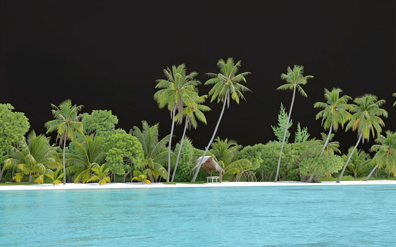 Изображение отличается высокой детализацией листвы пальм и плавными градиентами бирюзовой воды. Контраст между яркой растительностью и глубоким черным фоном подчеркивает четкость линий стволов и естественные блики на поверхности океана. Мягкие тени в прибрежной зоне создают объем, а насыщенные зеленые оттенки переданы без артефактов сжатия. На сайте доступен удобный предпросмотр перед скачиванием, чтобы оценить качество на экране.