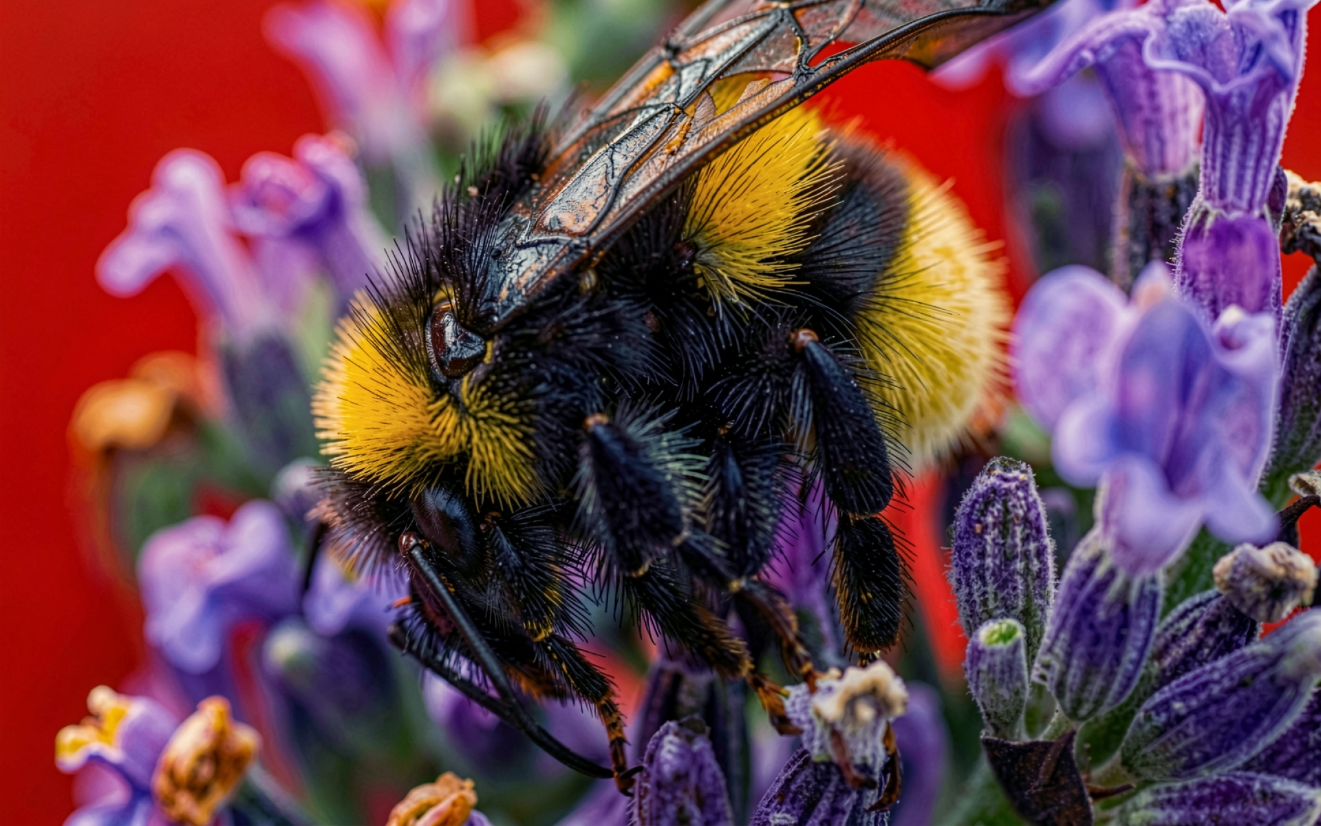Изображение отличается высокой детализацией ворса насекомого, где каждая ворсинка имеет четкий контур. Контраст между насыщенным красным фоном и глубокими фиолетовыми оттенками лепестков создает динамичную композицию. Особое внимание уделено бликам на прозрачном крыле и плавным градиентам в зонах перехода света и тени на брюшке шмеля. Перед скачиванием доступен удобный предпросмотр, позволяющий оценить четкость текстур непосредственно на экране.