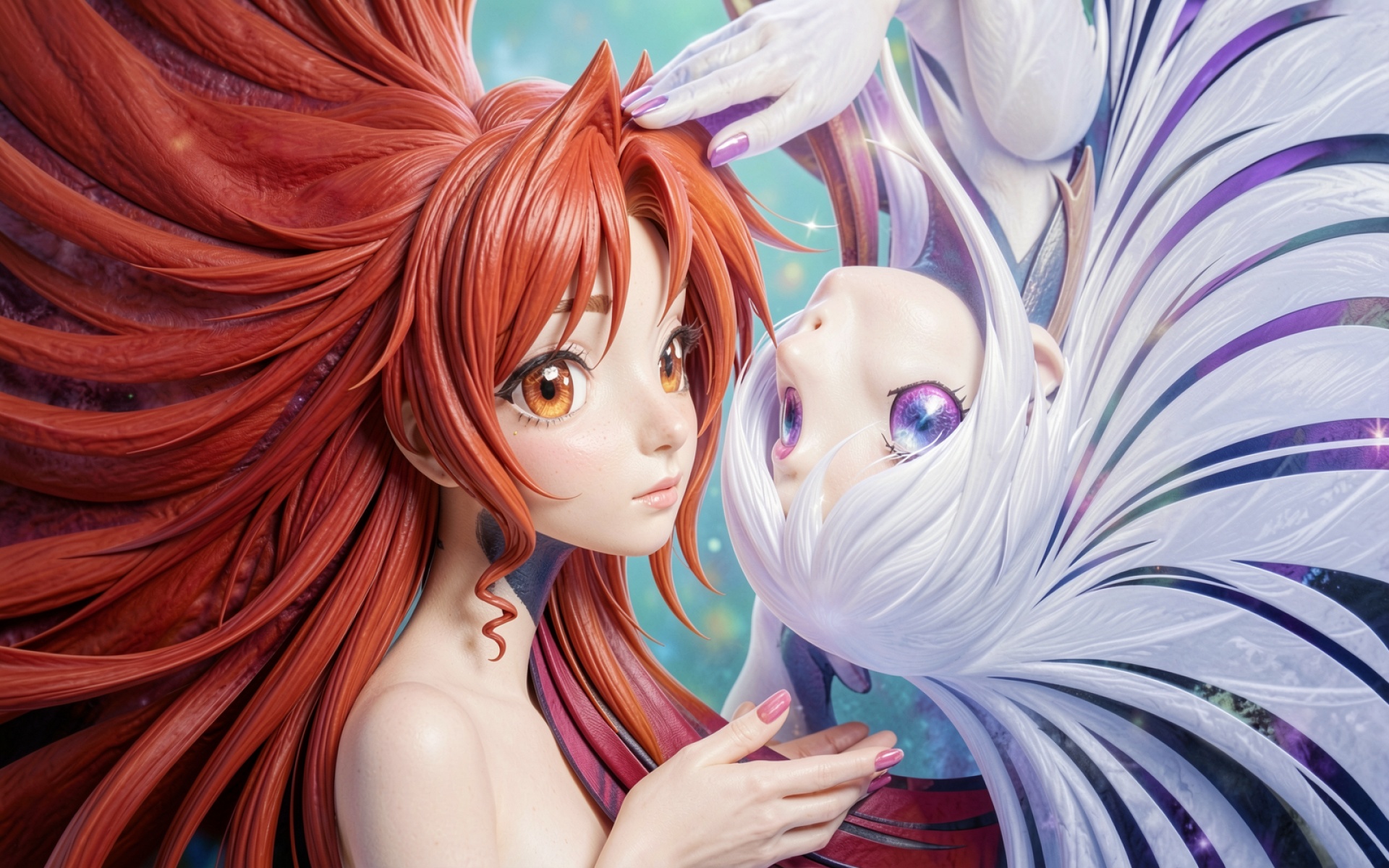 Эту картинку можно скачать для использования на рабочем столе или в качестве заставки. Изображение представляет собой детальный цифровой арт в стиле современного аниме, где центральное место занимает контраст между теплыми охристыми тонами рыжих волос и холодным белым оттенком второй героини.