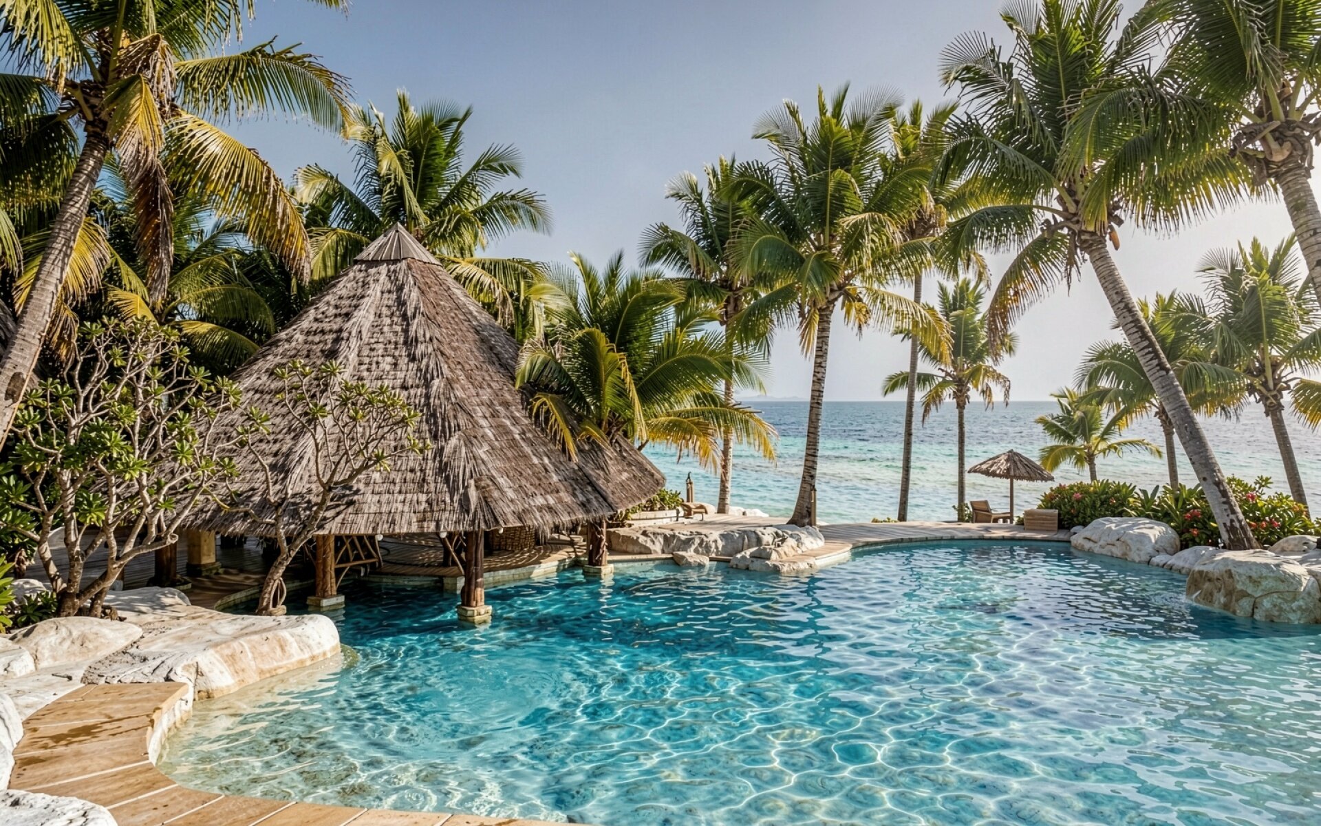 Изображение отличается высокой детализацией водной глади, где четко видны каустические блики и плавные переходы лазурных оттенков. Текстура соломенной крыши беседки передана с учетом микроконтраста, а естественное освещение создает мягкие тени под кронами пальм. Градиент неба плавно переходит от насыщенного голубого к светлому горизонту без артефактов сжатия. Перед загрузкой доступен удобный предпросмотр, позволяющий оценить четкость каждой детали на вашем экране.
