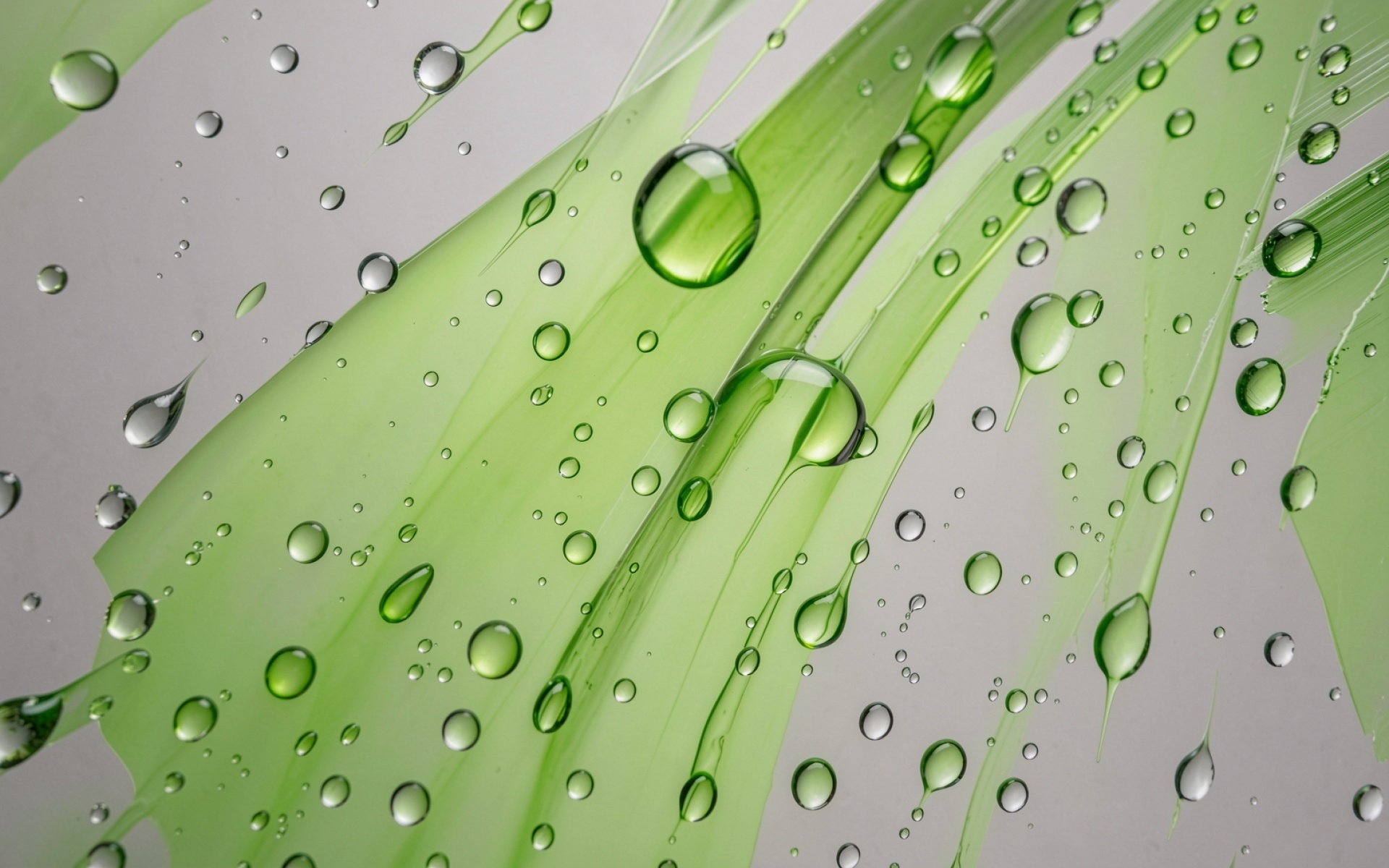 Изображение демонстрирует высокую детализацию сферических капель, которые работают как линзы, преломляя свет и создавая четкие блики. Текстура листа передана через плавные градиенты зеленого цвета с акцентом на прожилки и органические изгибы поверхности. Контраст между глянцевой влагой и матовым фоном подчеркивается мягкими тенями, что создает объем. Перед скачиванием доступен удобный предпросмотр для оценки качества цветопередачи на вашем экране.