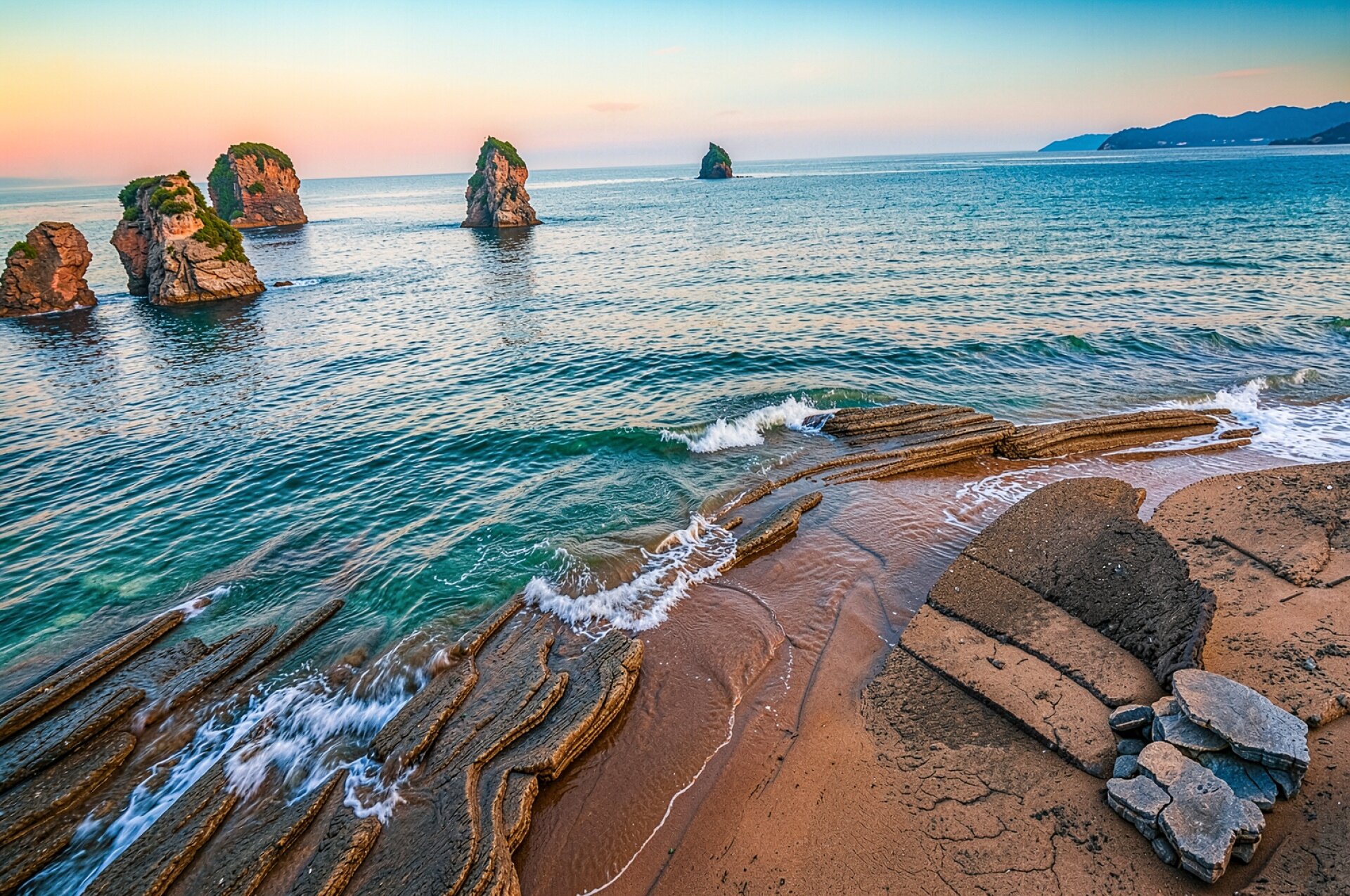 Изображение отличается высокой детализацией слоистых пород и текстуры мокрого песка. Освещение в золотой час создает мягкие градиенты на небе, которые контрастируют с глубокими тенями в расщелинах скал. Блики на поверхности воды и белая пена прибоя переданы четко, без размытия границ. На сайте доступен удобный предпросмотр перед скачиванием, чтобы оценить качество на экране.