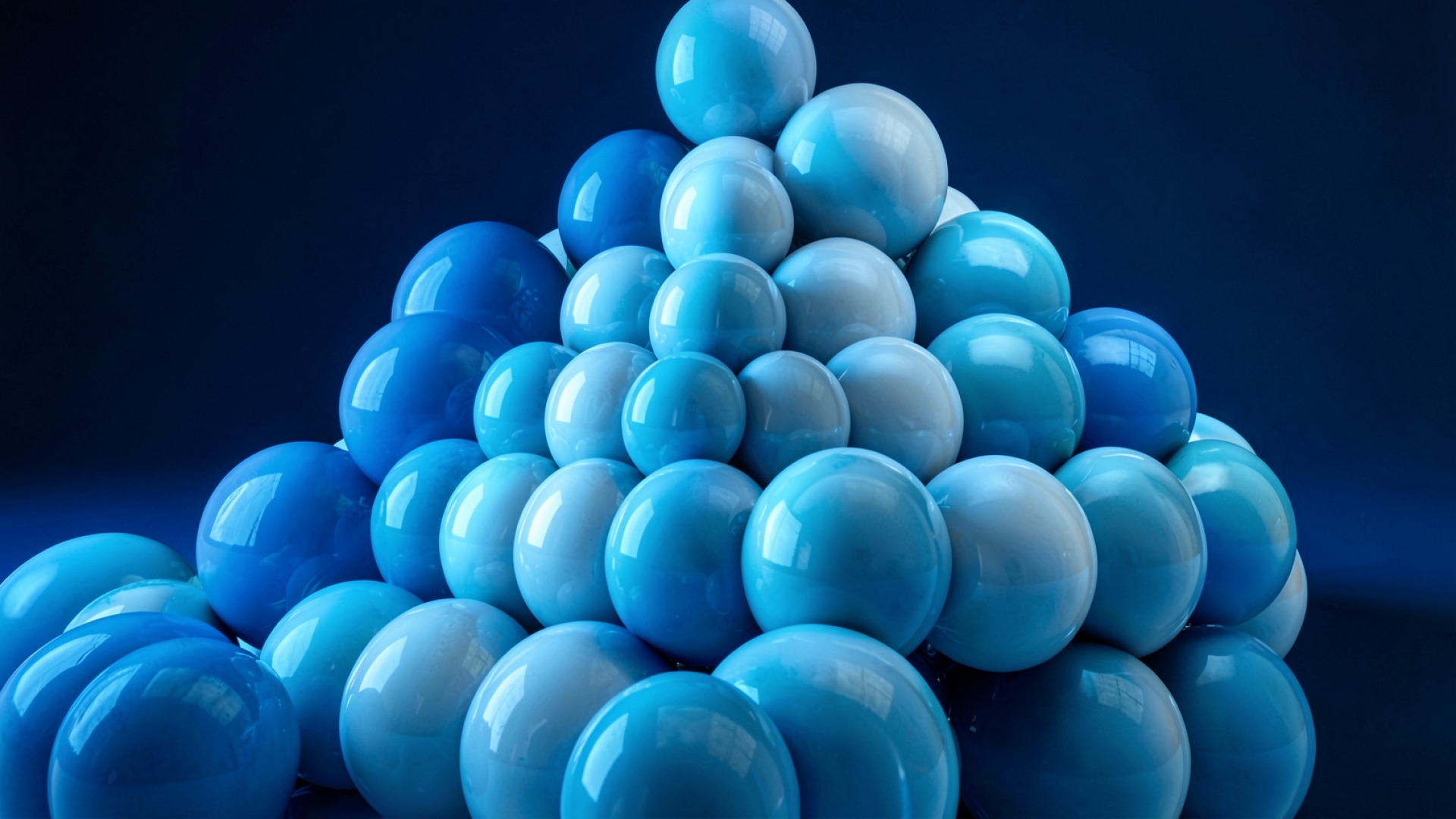 Изображение отличается высокой детализацией поверхности каждой сферы. Глянцевый слой создает четкие блики и плавные градиенты синего цвета, которые подчеркивают объемную структуру пирамиды. Мягкое освещение формирует глубокие тени в местах соприкосновения объектов, создавая эффект трехмерности на темном фоне. Перед скачиванием доступен удобный предпросмотр, позволяющий оценить чистоту переходов цвета и отсутствие артефактов на экране.
