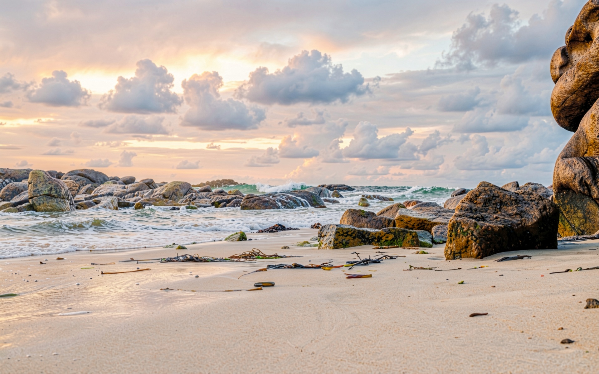 Изображение отличается высокой детализацией текстур прибрежных валунов и пены морских волн. Мягкие градиенты закатного неба плавно переходят от золотистых к серо-голубым тонам, создавая естественное освещение с глубокими тенями в расщелинах камней. Блики на мокром песке и поверхности скал подчеркивают объем сцены. На сайте доступен удобный предпросмотр перед скачиванием, чтобы оценить качество на экране.