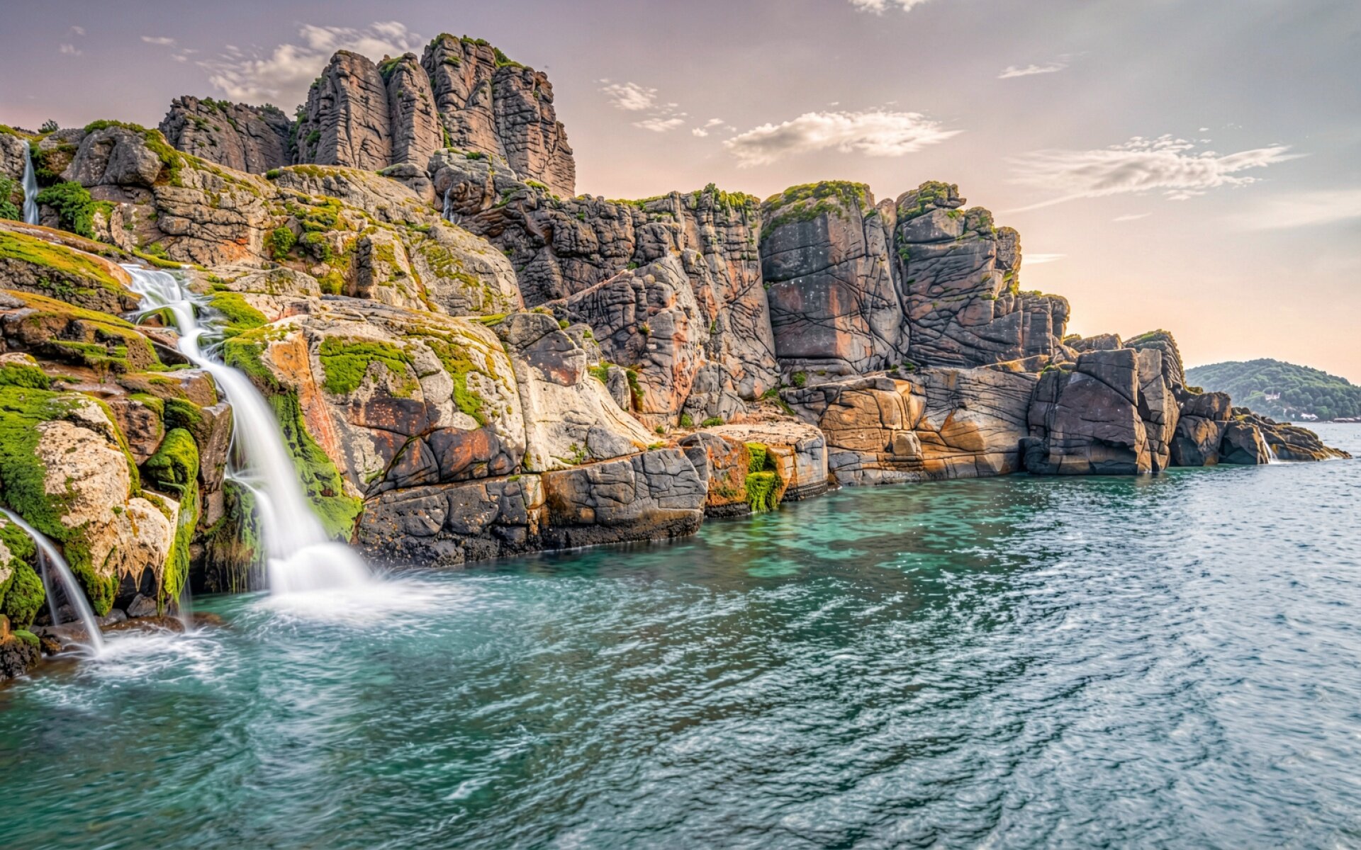 Водопад среди скал у бирюзового океана обои