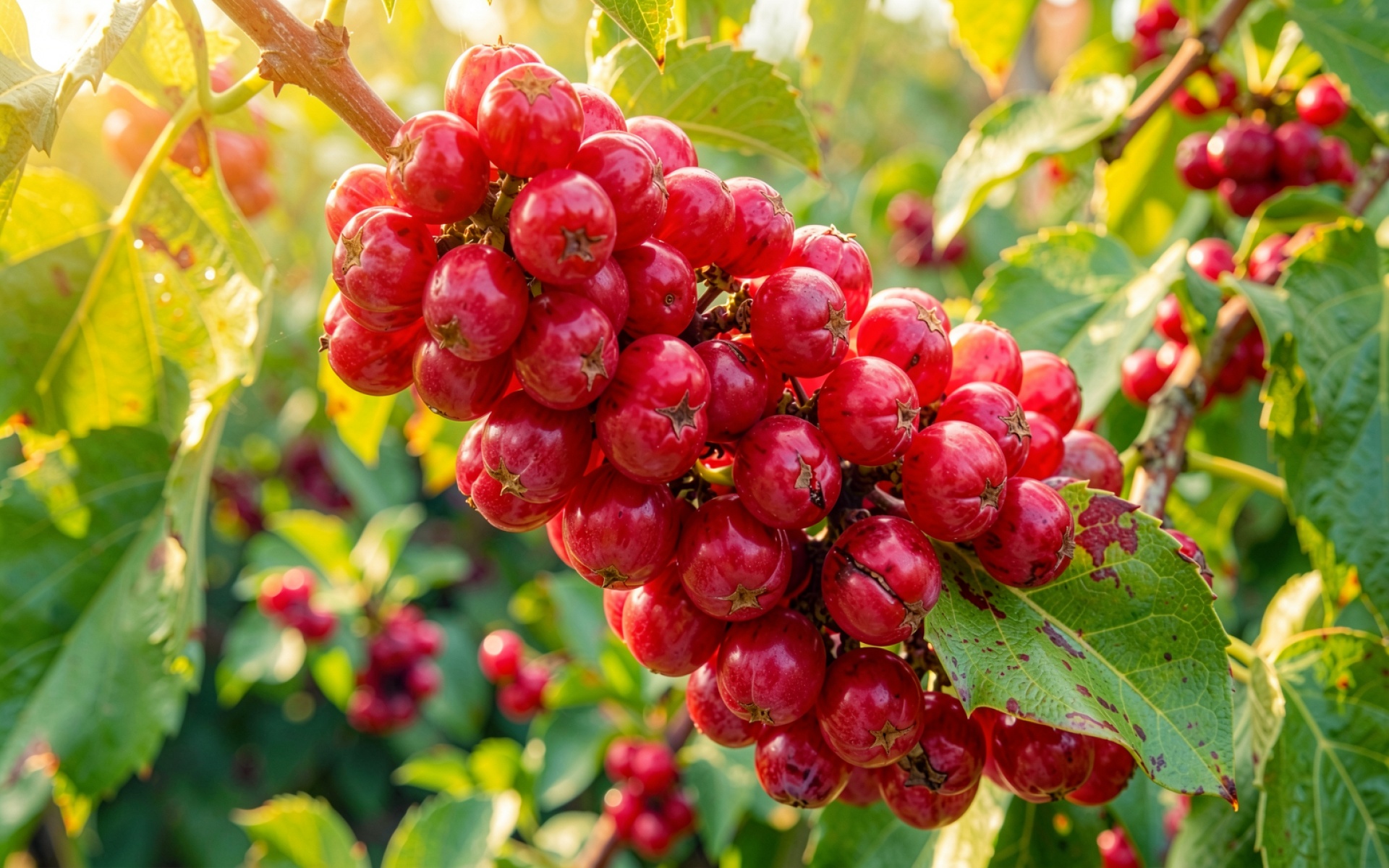 Изображение отличается высокой детализацией глянцевой поверхности ягод, где четко видны точечные блики от солнечного света. Мягкие градиенты на фоне создают эффект глубины, а естественные тени между плодами подчеркивают объем грозди. Текстура зеленых листьев передана с акцентом на прожилки и микрорельеф поверхности. На сайте доступен удобный предпросмотр перед скачиванием, чтобы оценить качество на экране.