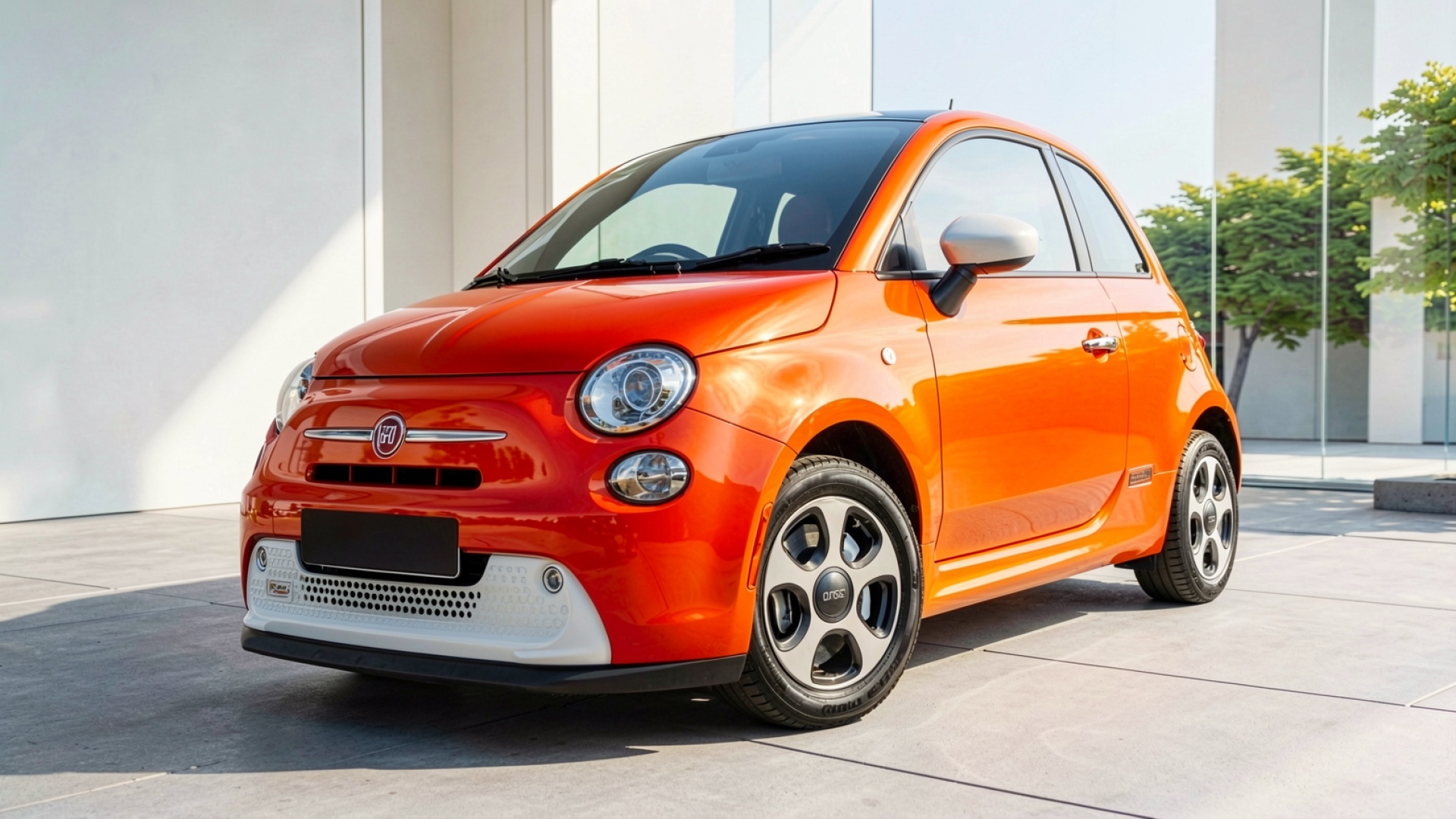 Оранжевый автомобиль Fiat 500 в минималистичном интерьере обои