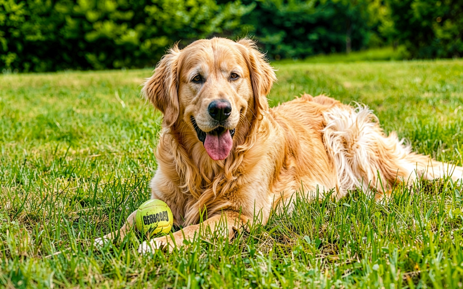 Скачайте с нашего сайта обои «Золотистый ретривер с мячом на зеленой траве» в формате JPG, потому что альтернативы сжимают сильнее, а мы даём оригинал.