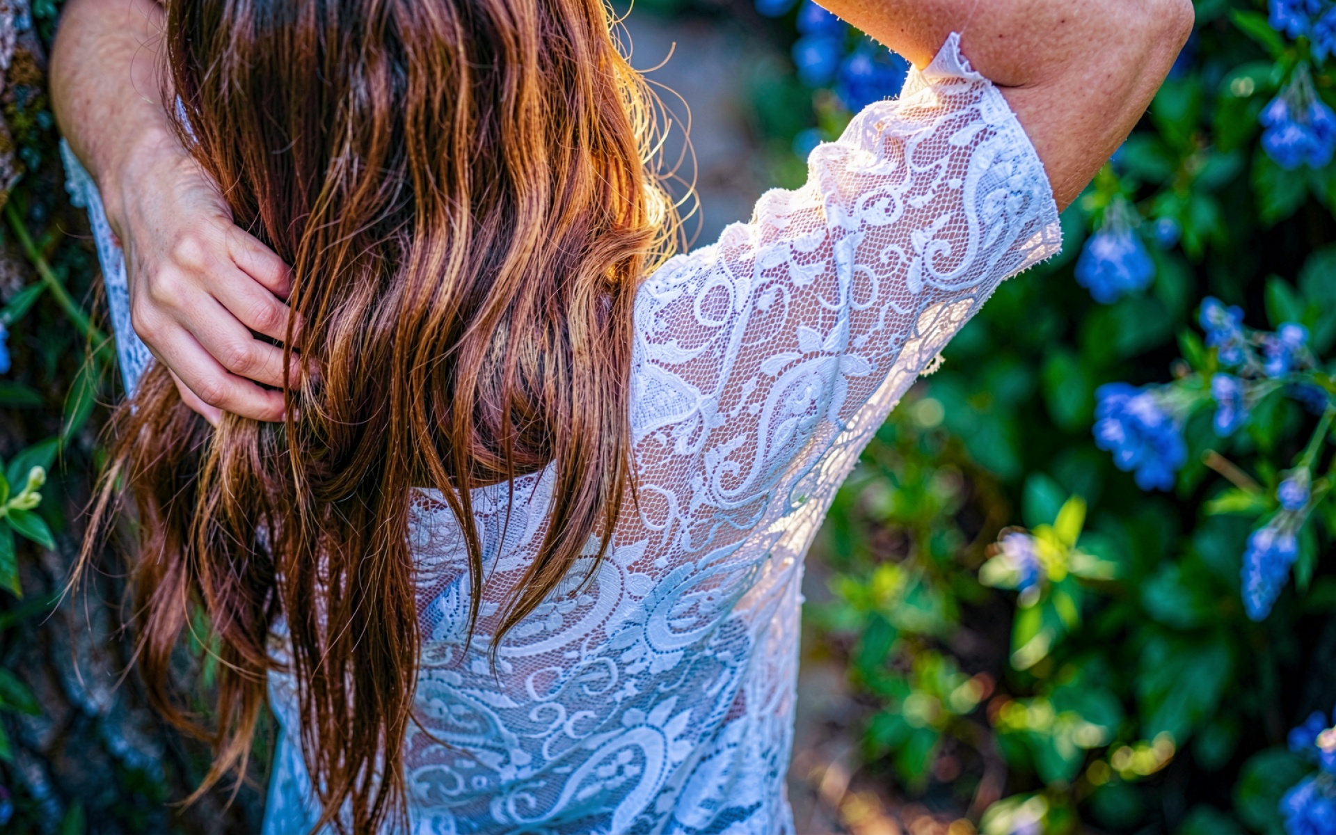 Изображение отличается высокой детализацией плетения кружева и естественной передачей текстуры волос. Мягкое освещение создает плавные градиенты на белой ткани, подчеркивая объем и создавая реалистичные блики. Контраст между светлым платьем и насыщенным зеленым фоном с синими акцентами цветов делает композицию глубокой. Перед скачиванием доступен удобный предпросмотр, позволяющий оценить четкость линий и проработку теней на вашем экране.