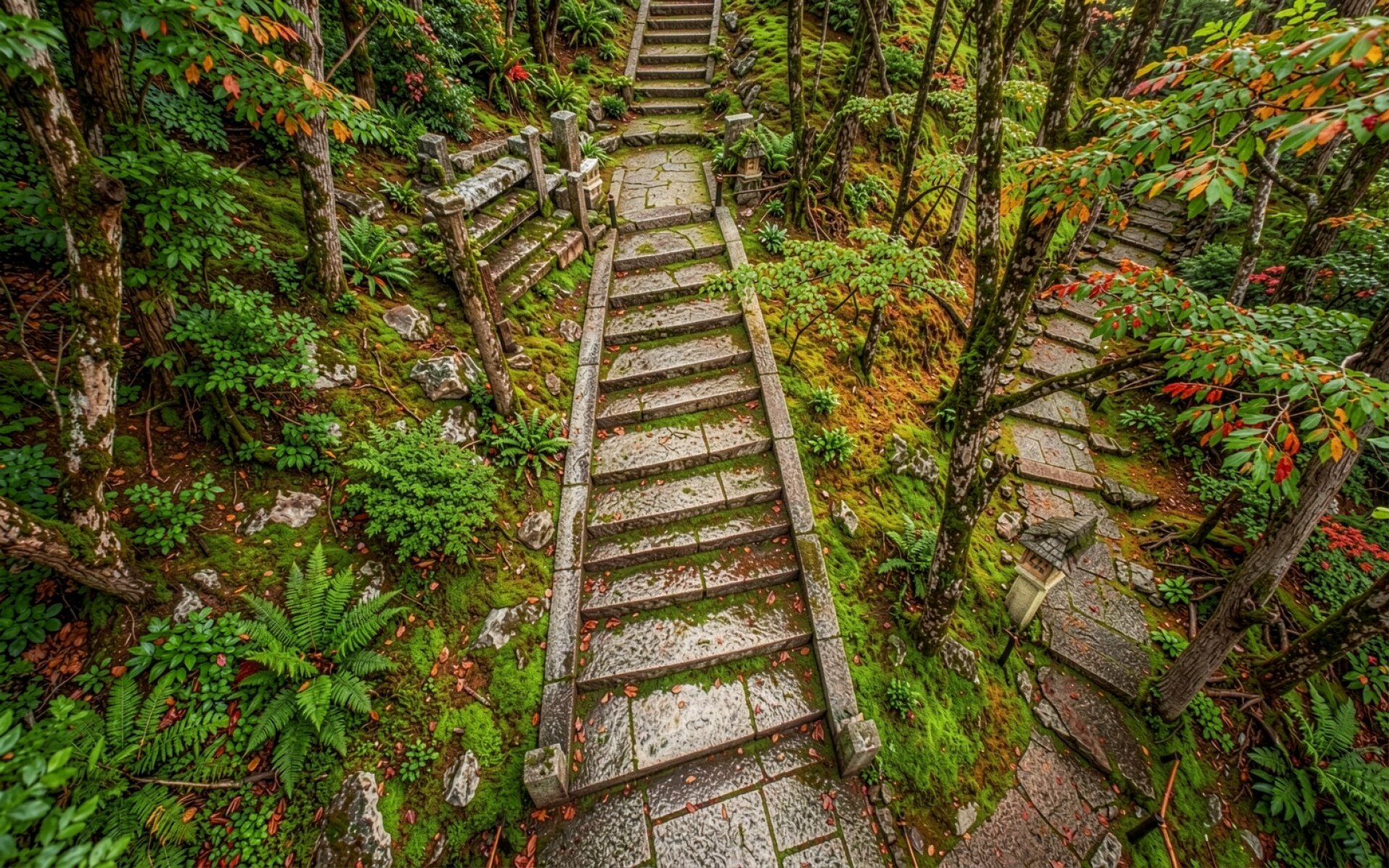 Каменная лестница в густом зеленом лесу обои