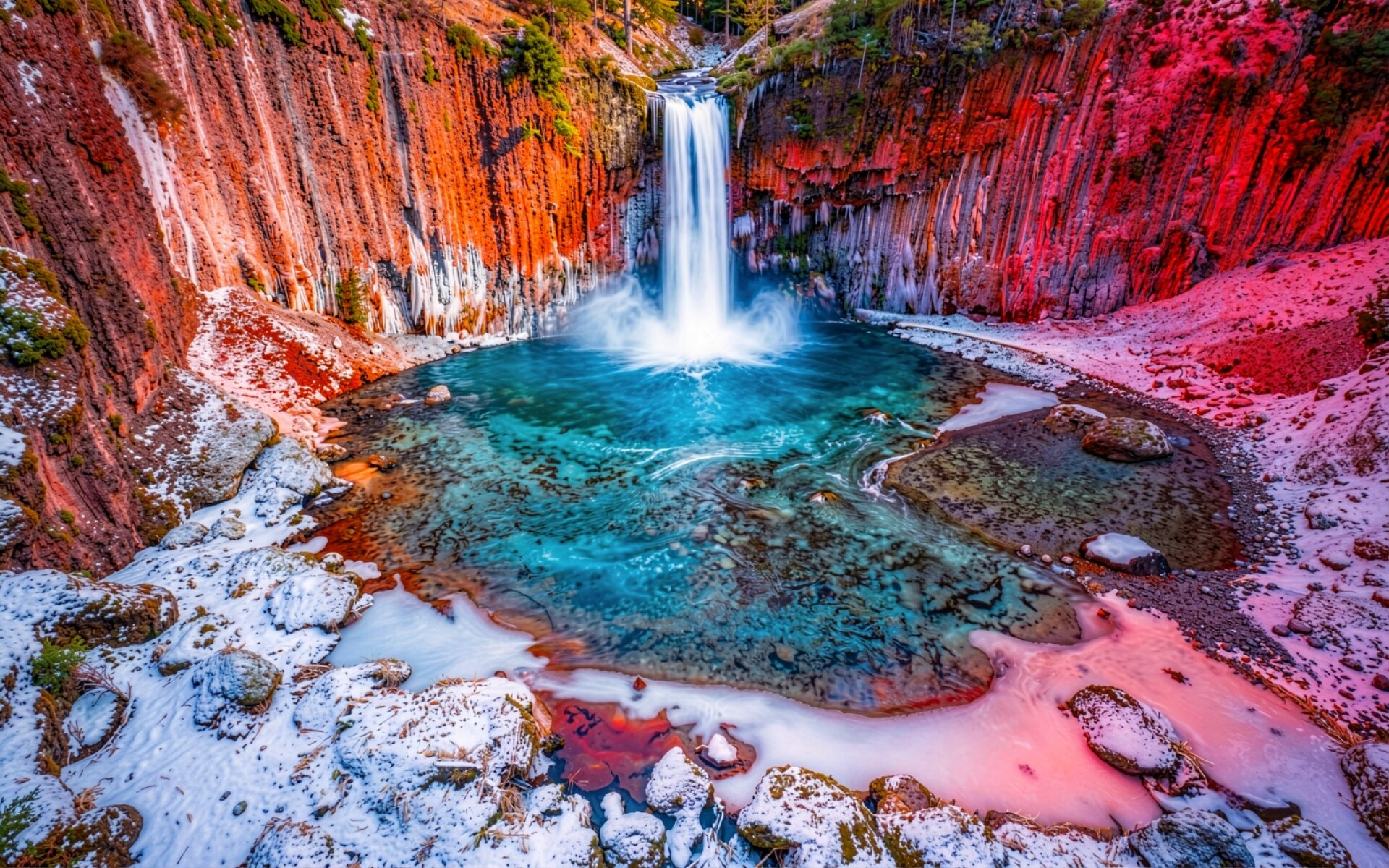 Изображение отличается высокой детализацией потоков воды и четкой прорисовкой заснеженных камней. Контраст между холодным бирюзовым оттенком озера и теплыми красными тонами скал создает динамичный градиент фона. Особое внимание уделено мягким бликам на поверхности воды и глубоким теням в расщелинах утесов, что придает сцене объем. Перед загрузкой доступен удобный предпросмотр для оценки качества цветопередачи на вашем экране.