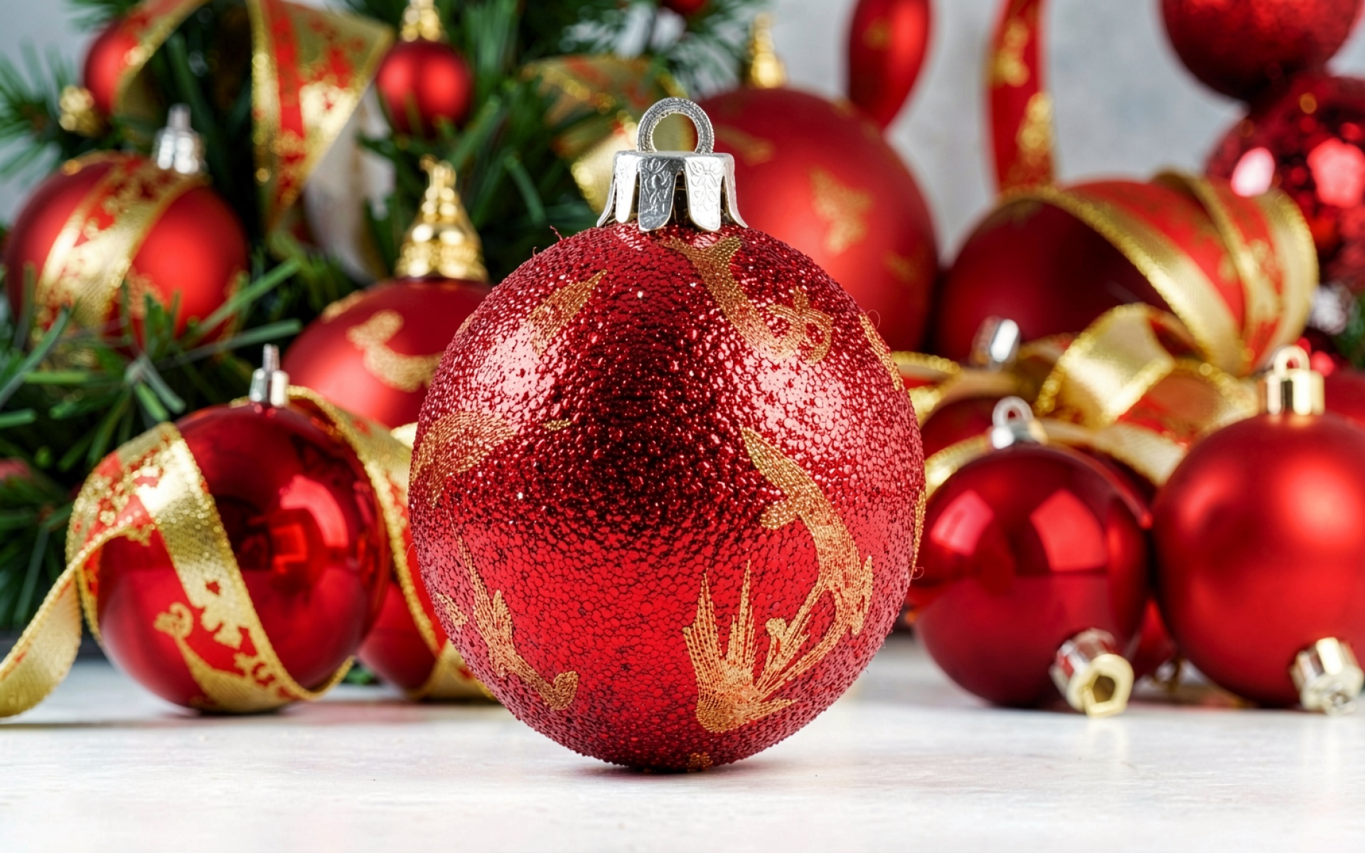 Изображение отличается высокой детализацией глиттерной поверхности центрального объекта, где каждая частица блесток создает микроконтраст. Золотые орнаменты имеют четкие границы без размытия, а мягкий градиент красного цвета плавно переходит в глубокие тени. Освещение подчеркивает сферическую форму через точечные блики и аккуратные рефлексы на поверхности соседних элементов. Перед загрузкой доступен удобный предпросмотр, позволяющий оценить чистоту цветовых переходов на экране.