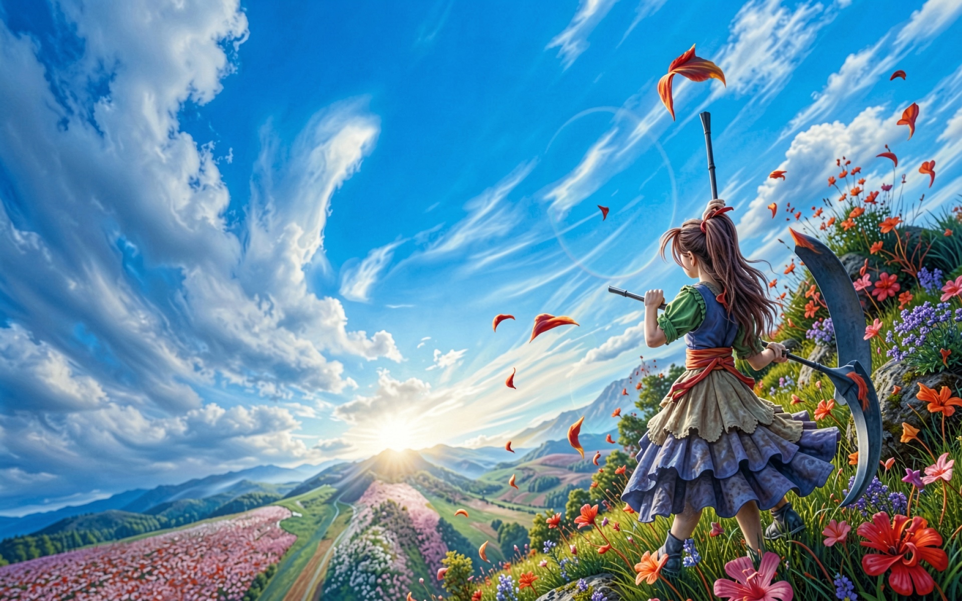 Изображение отличается высокой детализацией текстур ткани платья и металлических бликов на лезвии косы. Освещение имитирует контровой свет заходящего солнца, создавая мягкие градиенты в небе и глубокие тени в складках одежды. На сайте реализован удобный предпросмотр перед скачиванием, чтобы оценить качество цветопередачи на экране.