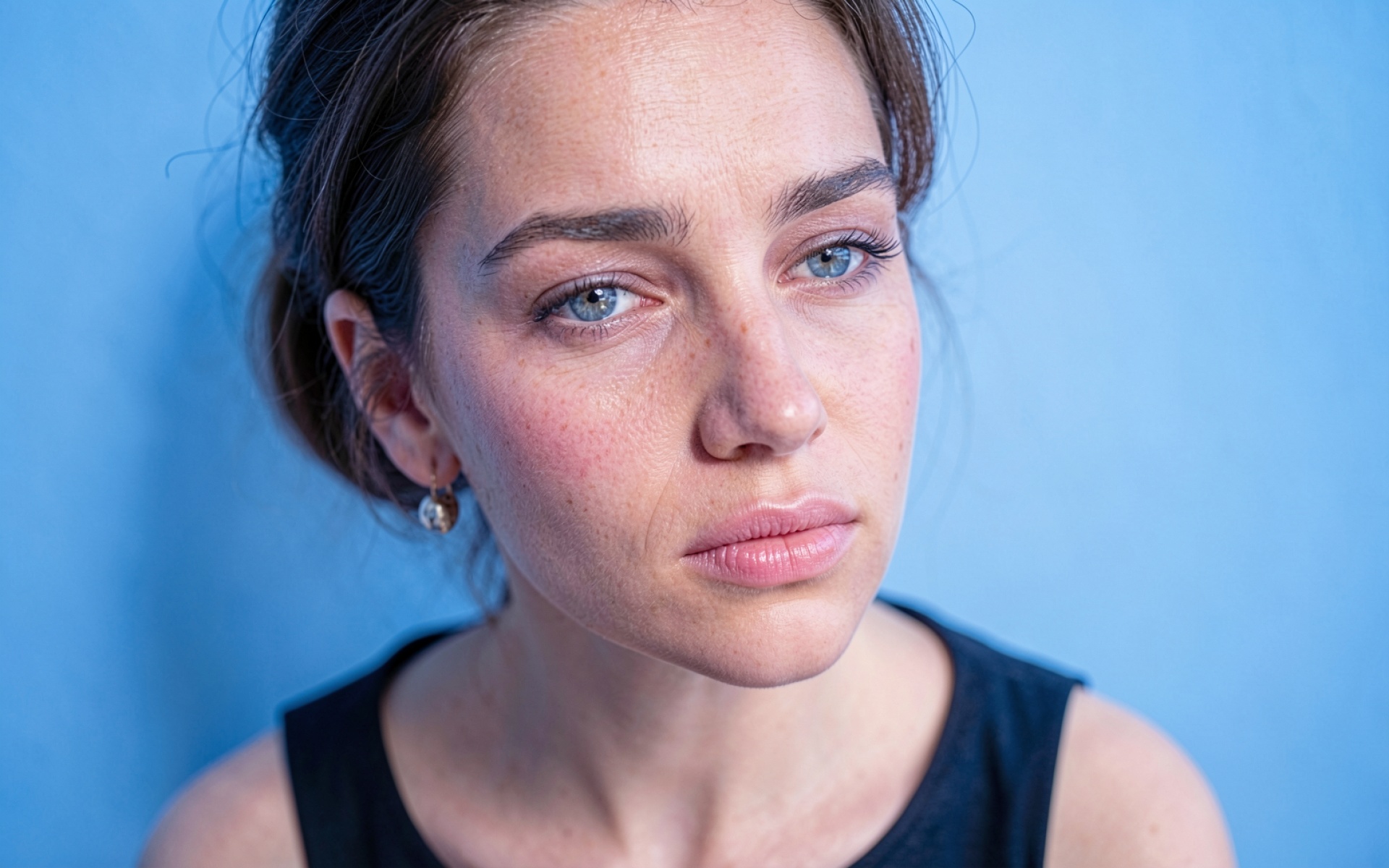Изображение отличается высокой детализацией кожного покрова, где четко видны естественные поры и микрорельеф кожи. Мягкое фронтальное освещение создает плавные градиенты на лице, минимизируя жесткие тени и подчеркивая глубину взгляда. Голубой фон имеет однородную заливку, что создает контраст с теплыми оттенками кожи и бликами в глазах. Перед загрузкой доступен предпросмотр для оценки цветопередачи и четкости линий на вашем экране.
