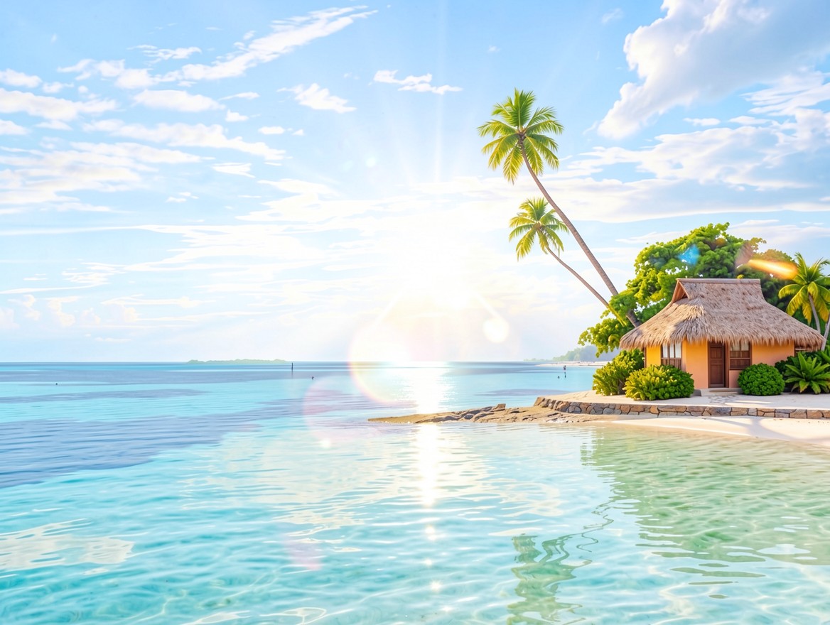 Изображение отличается высокой детализацией соломенной крыши хижины и четкой прорисовкой листьев пальм. Освещение имитирует яркий зенитный свет, создавая контрастные тени на песке и мягкие блики на поверхности бирюзовой воды. Плавные градиенты голубого неба переходят в насыщенные оттенки океана, а встроенный предпросмотр позволяет оценить чистоту цветовых переходов перед сохранением файла.