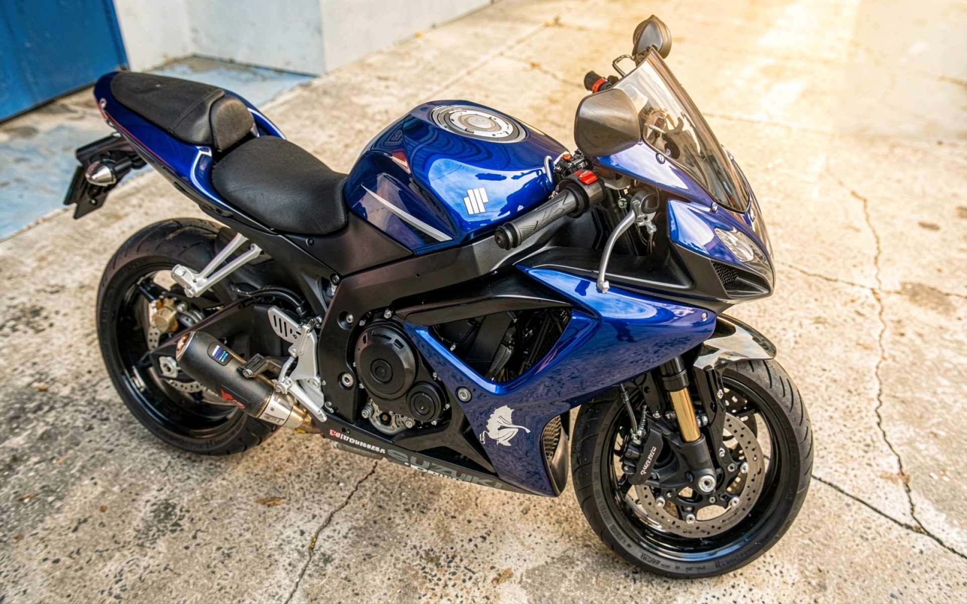Скачайте изображение спортивного мотоцикла в высоком разрешении для использования в качестве обоев рабочего стола или заставки смартфона, чтобы добавить динамики вашему интерфейсу. Данный кадр демонстрирует глубокий синий металлик кузова и агрессивную геометрию обтекателей, характерную для серии GSX-R.