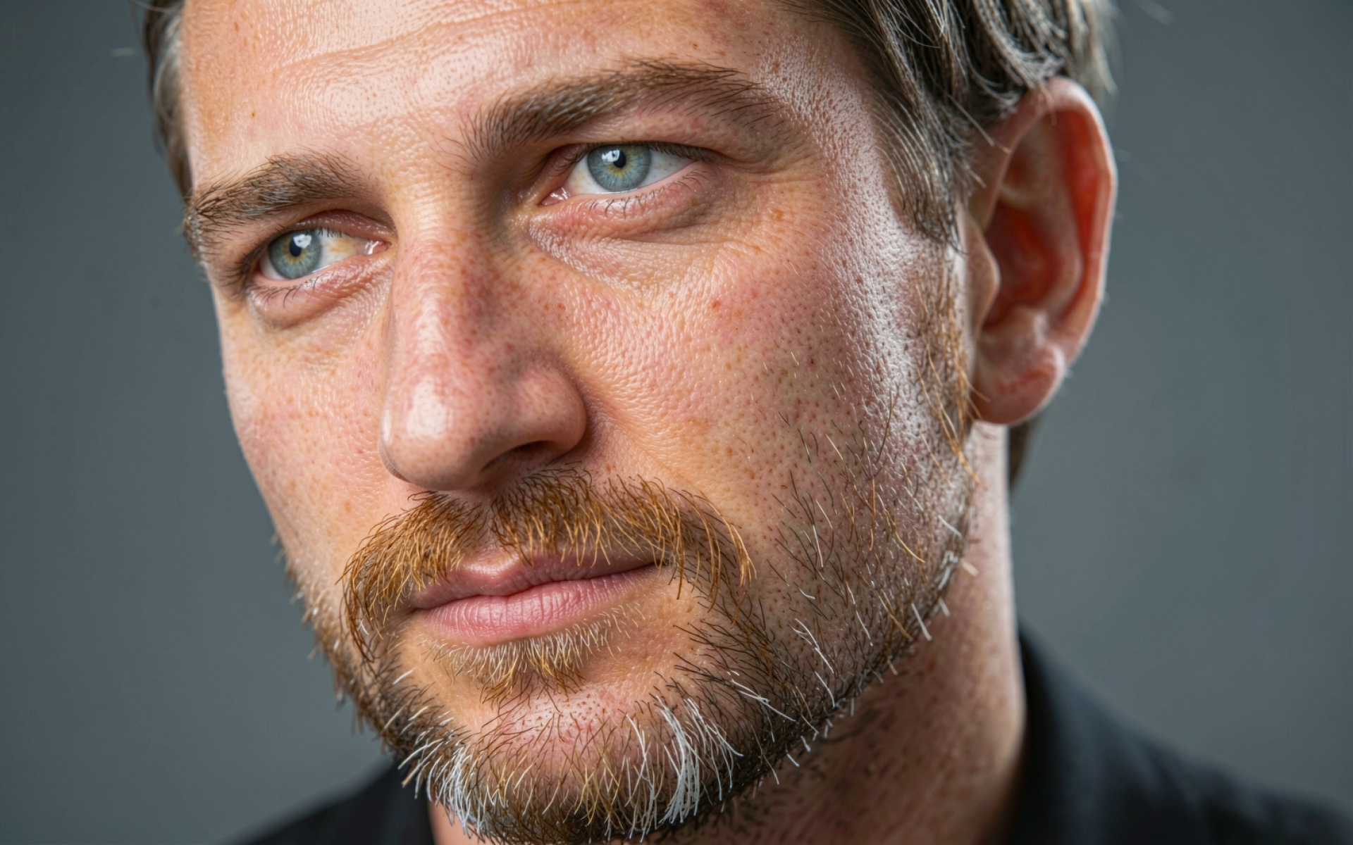 Изображение отличается высокой детализацией кожного покрова, где четко видны поры и микрорельеф кожи. Особое внимание уделено текстуре волос в области бороды и усов, где каждый волосок отделен от соседнего благодаря правильной работе с контрастом. Мягкий свет создает плавные градиенты на сером фоне, формируя естественные тени в области скул и носогубных складок. Блики в голубых глазах добавляют глубины взгляду. На сайте доступен удобный предпросмотр перед скачиванием, чтобы оценить качество на экране.