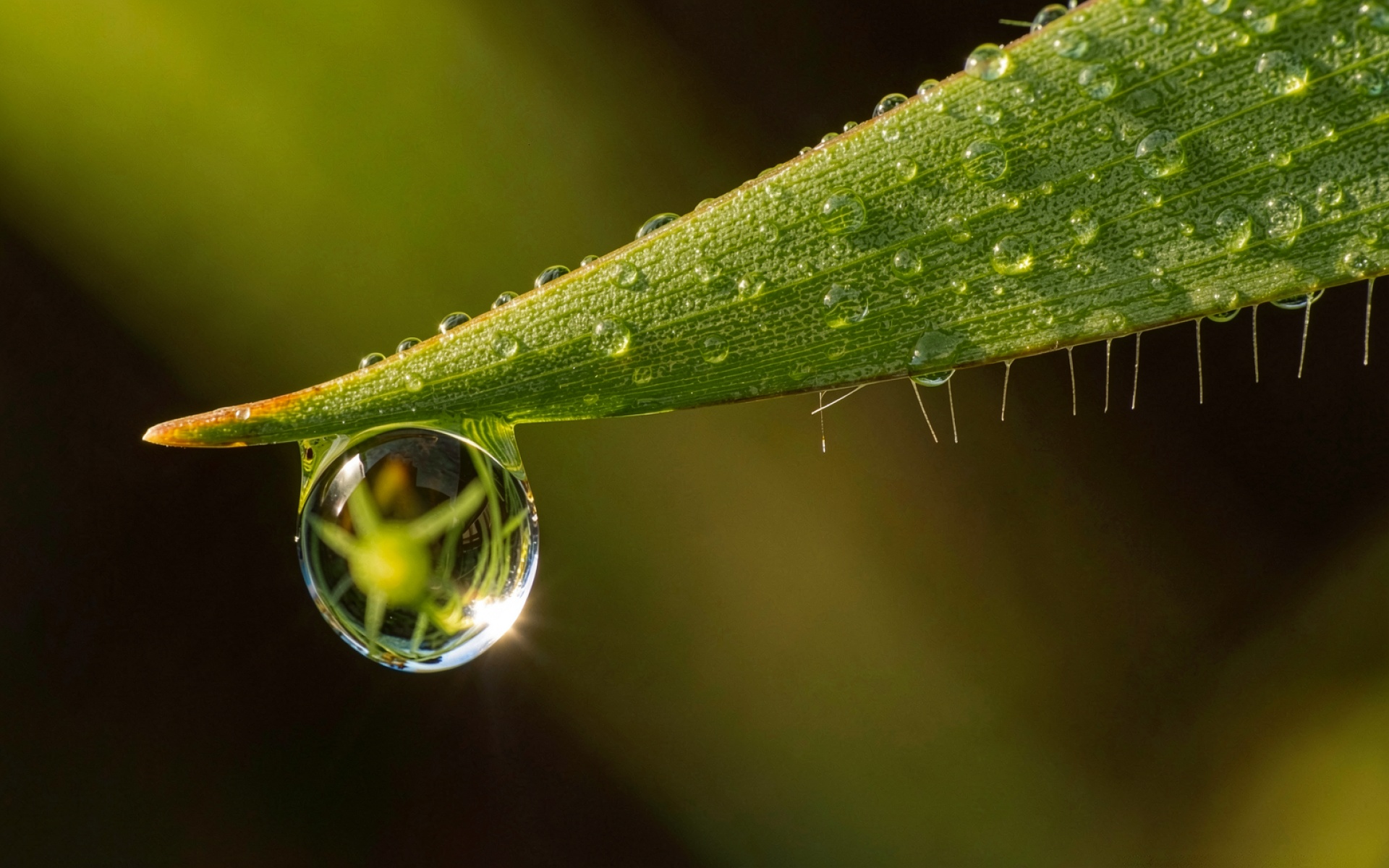 Изображение отличается высокой четкостью микротекстур растительного волокна и сферической формы капли. Оптический эффект преломления света внутри водяного шара создает детальное отражение окружающего пространства, а мягкие градиенты фона подчеркивают контраст между насыщенным зеленым цветом листа и темным окружением. Точечные блики на поверхности воды и тонкие тени от ворсинок травы добавляют глубины сцене. Перед скачиванием доступен удобный предпросмотр, позволяющий оценить чистоту переходов цвета на вашем экране.