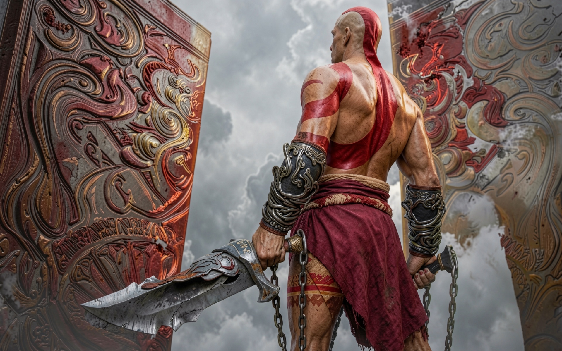 Изображение отличается высокой детализацией кожного покрова персонажа и текстуры металла на клинках. Освещение подчеркивает рельеф мышц, создавая глубокие тени в складках ткани и четкие блики на стальных поверхностях оружия. Плавные градиенты серого неба контрастируют с насыщенными охристыми оттенками резных ворот. Перед скачиванием доступен удобный предпросмотр, позволяющий оценить чистоту линий и отсутствие артефактов сжатия на вашем экране.