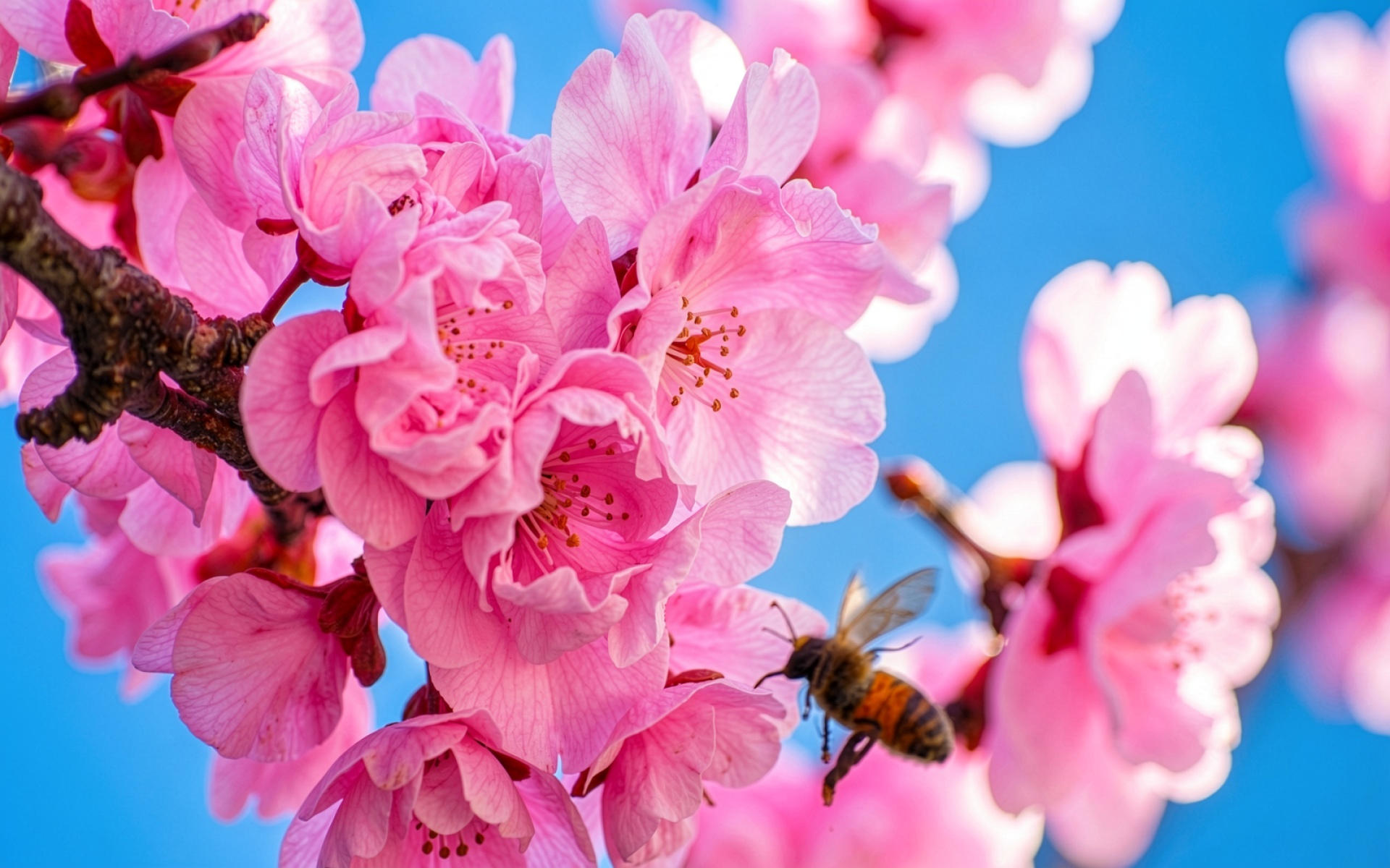 Эту фотографию можно скачать для использования в качестве высококачественного фона, так как она сочетает природную гармонию и высокую детализацию макросъемки. Изображение демонстрирует весеннее цветение с акцентом на текстуру лепестков и динамику полета насекомого.