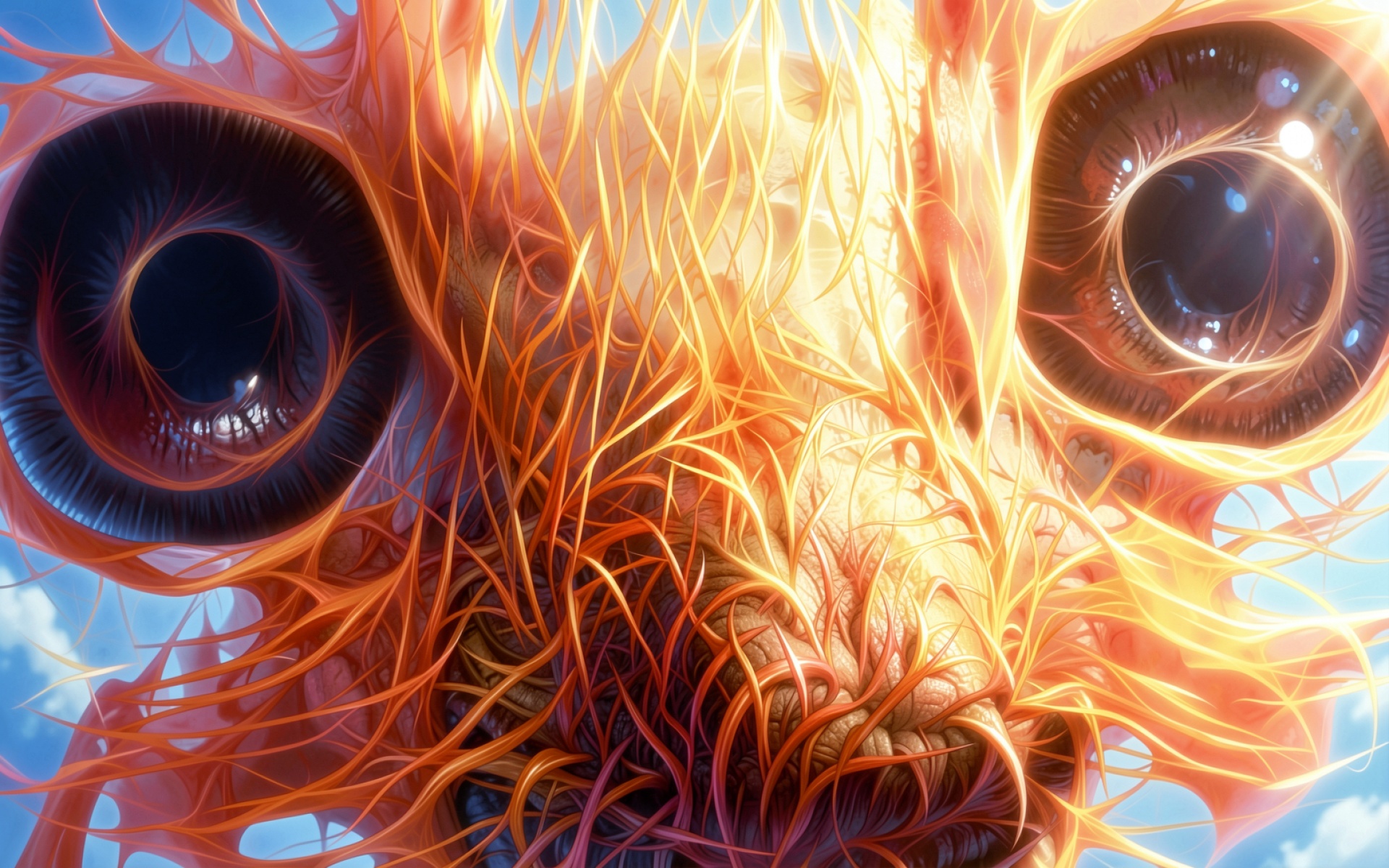 Изображение отличается высокой детализацией органических волокон, имитирующих потоки пламени. Особое внимание уделено бликам в зрачках и плавным градиентам от ярко-желтого к насыщенному оранжевому. Контрастные тени подчеркивают объем каждой нити, создавая эффект трехмерности на фоне светлого неба. Перед загрузкой доступен удобный предпросмотр, позволяющий оценить четкость текстур и чистоту цветовых переходов на вашем экране.