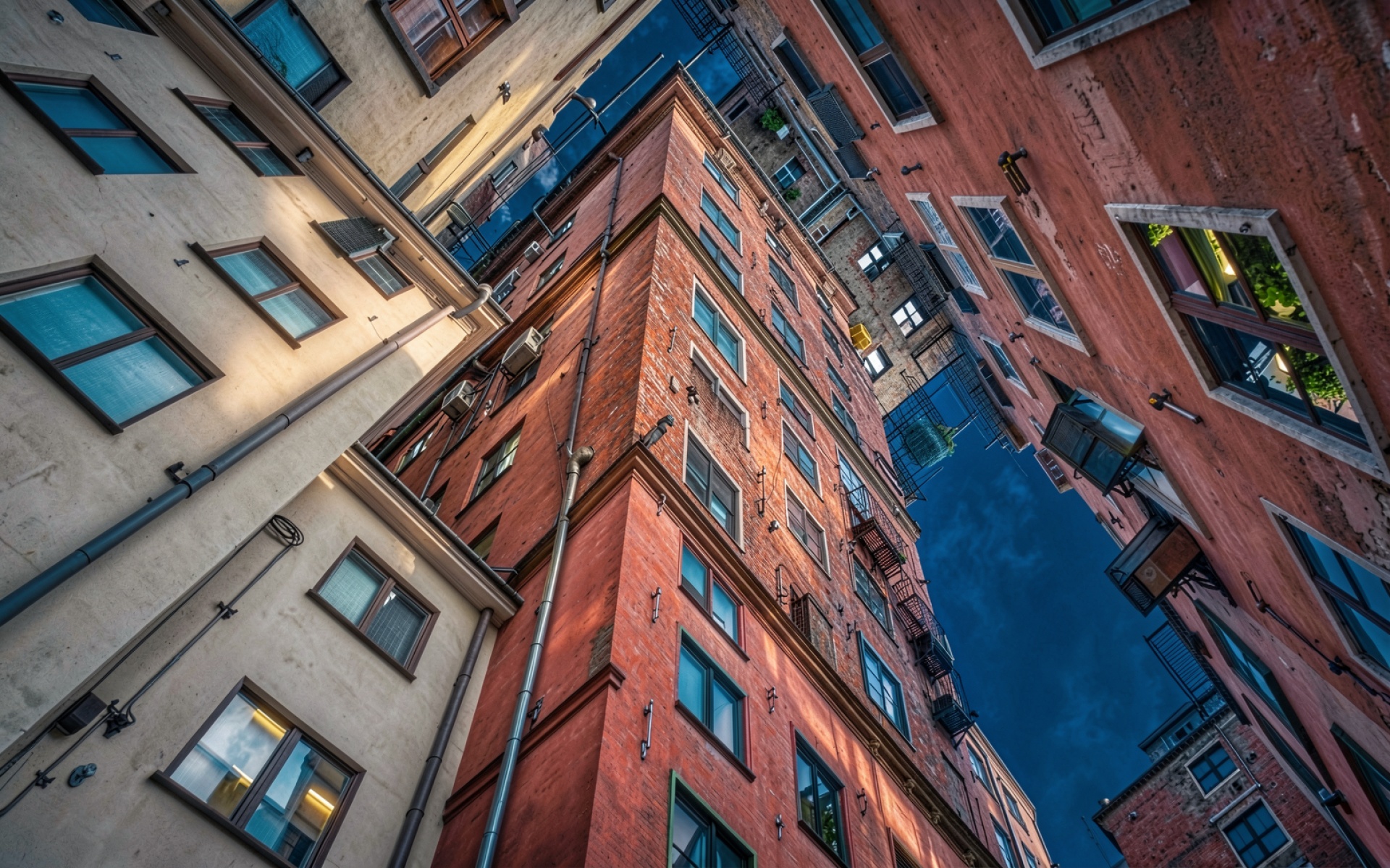 Изображение отличается высокой детализацией кладки кирпича и четкостью линий архитектурных форм. Освещение создает выразительный контраст между затененными участками фасадов и яркими бликами на оконных стеклах. Плавные градиенты темно-синего неба подчеркивают вертикальную геометрию сцены, а глубокие тени добавляют объему. На сайте доступен удобный предпросмотр перед скачиванием, чтобы оценить качество на экране.