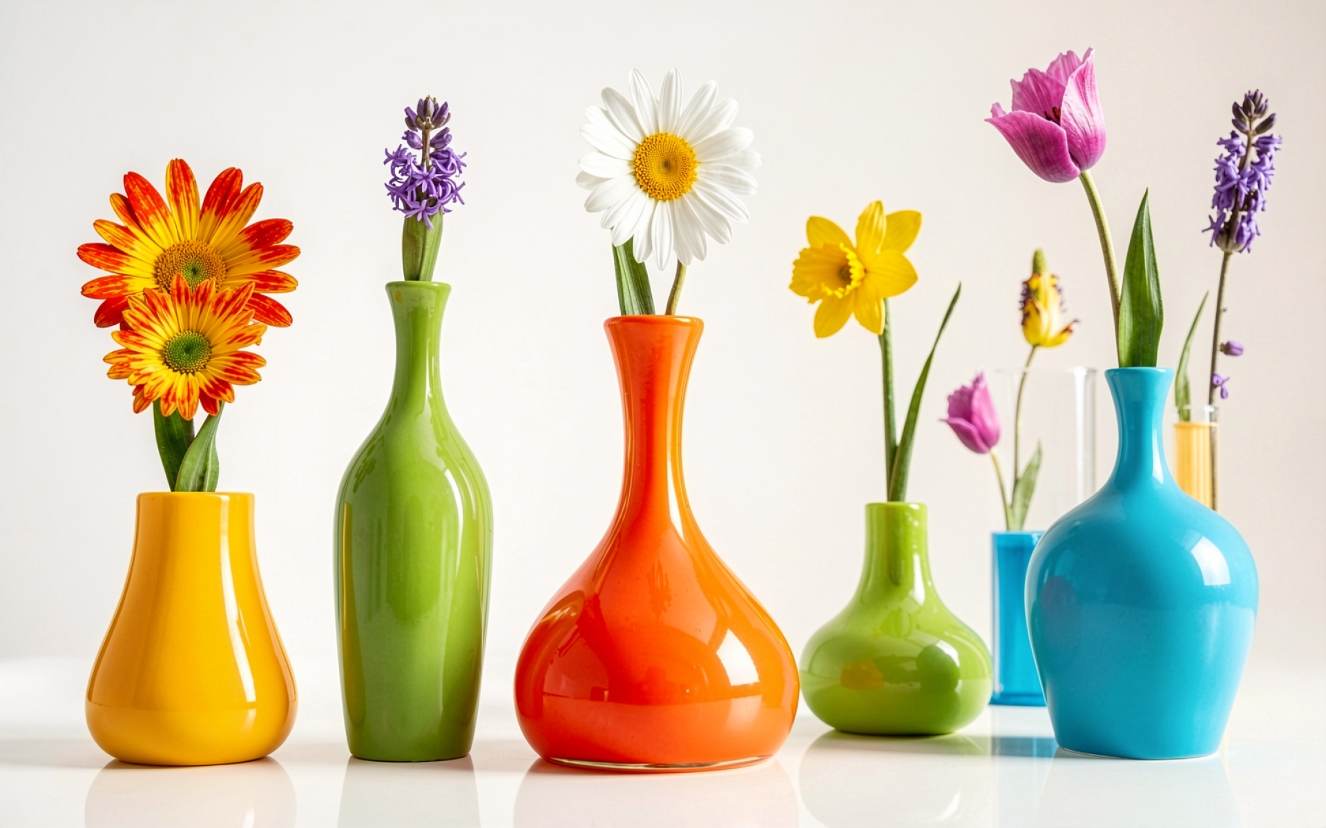 Изображение отличается высокой четкостью контуров керамических сосудов и естественной передачей цветовых градиентов. Особое внимание уделено бликам на глянцевых поверхностях ваз и мягким теням, которые создают объем на белом фоне. Текстуры лепестков цветов проработаны детально, что обеспечивает визуальную чистоту композиции. На сайте доступен удобный предпросмотр перед скачиванием, чтобы оценить качество на экране.