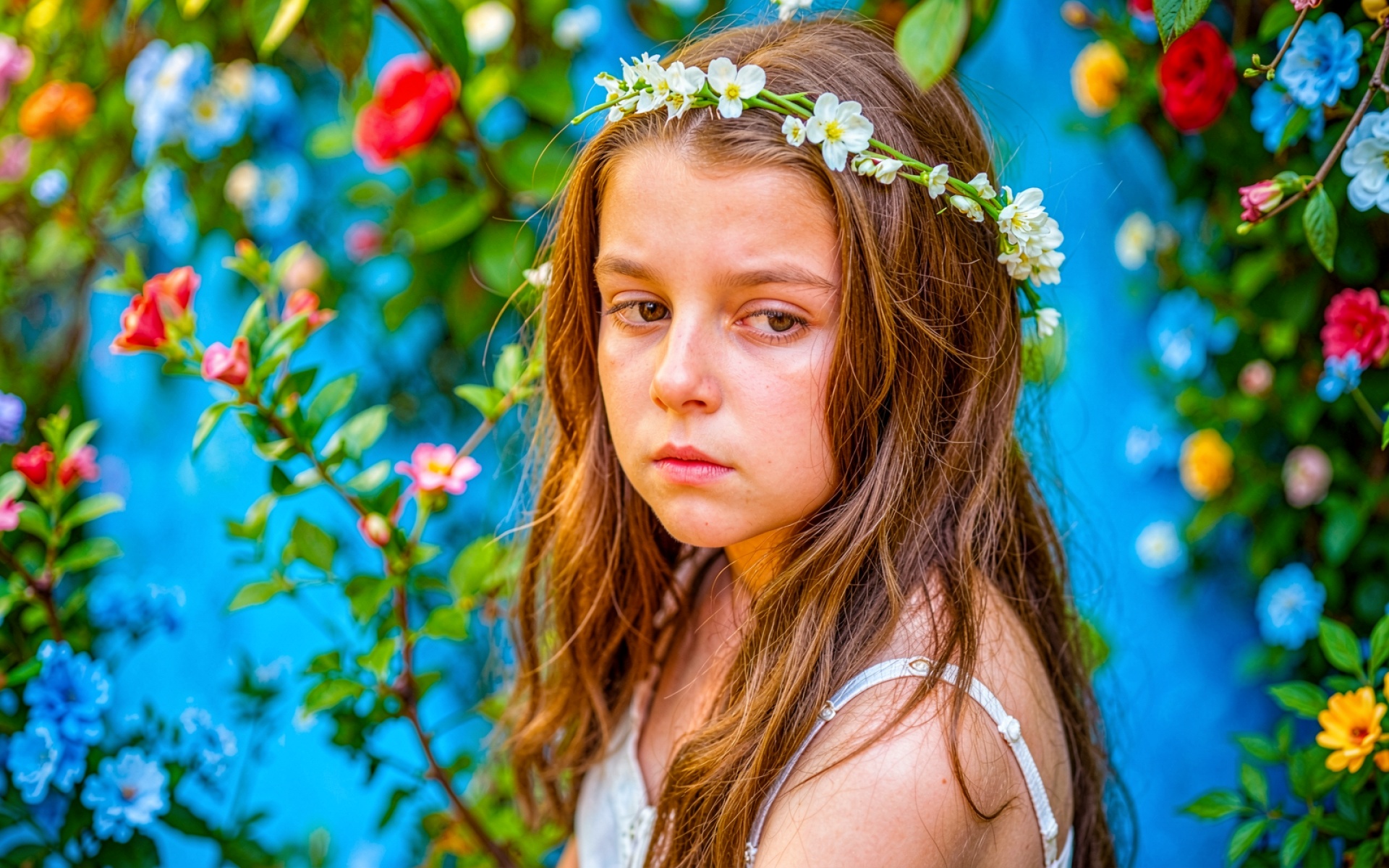 Девочка в цветочном венке на синем фоне обои