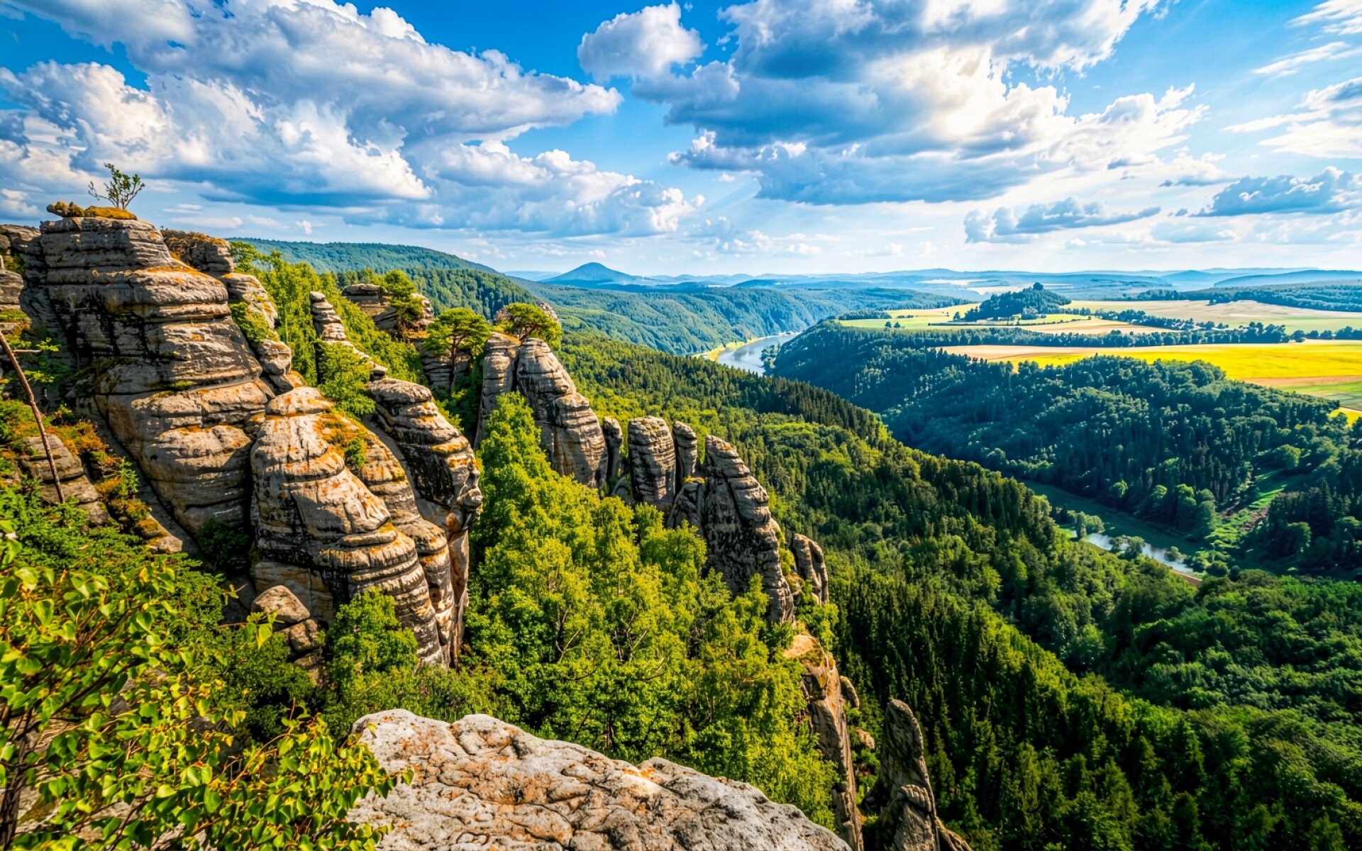 Изображение отличается высокой детализацией эрозийных форм камня и выразительной текстурой коры деревьев. Естественное освещение создает четкие контрасты между освещенными гранями скал и глубокими тенями в лесных массивах, а мягкие градиенты голубого неба плавно переходят в белизну кучевых облаков. На сайте доступен удобный предпросмотр перед скачиванием, чтобы оценить качество цветопередачи на экране.