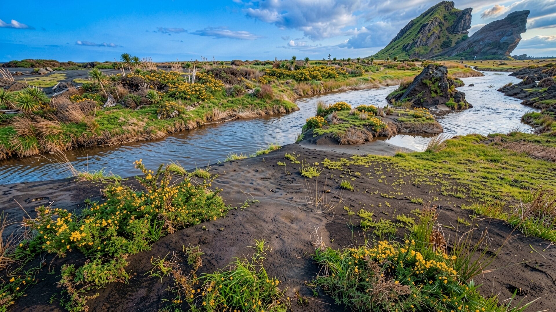 Изображение отличается высокой детализацией текстур темного вулканического грунта и органических переходов зеленой травы. Освещение создает мягкие градиенты на поверхности воды и четкие блики на склонах скал, подчеркивая объем рельефа. Контраст между насыщенным синим небом и теплыми оттенками желтых цветов реализован через плавные цветовые переходы без артефактов. Перед загрузкой доступен удобный предпросмотр, позволяющий оценить проработку теней и четкость линий на вашем экране.