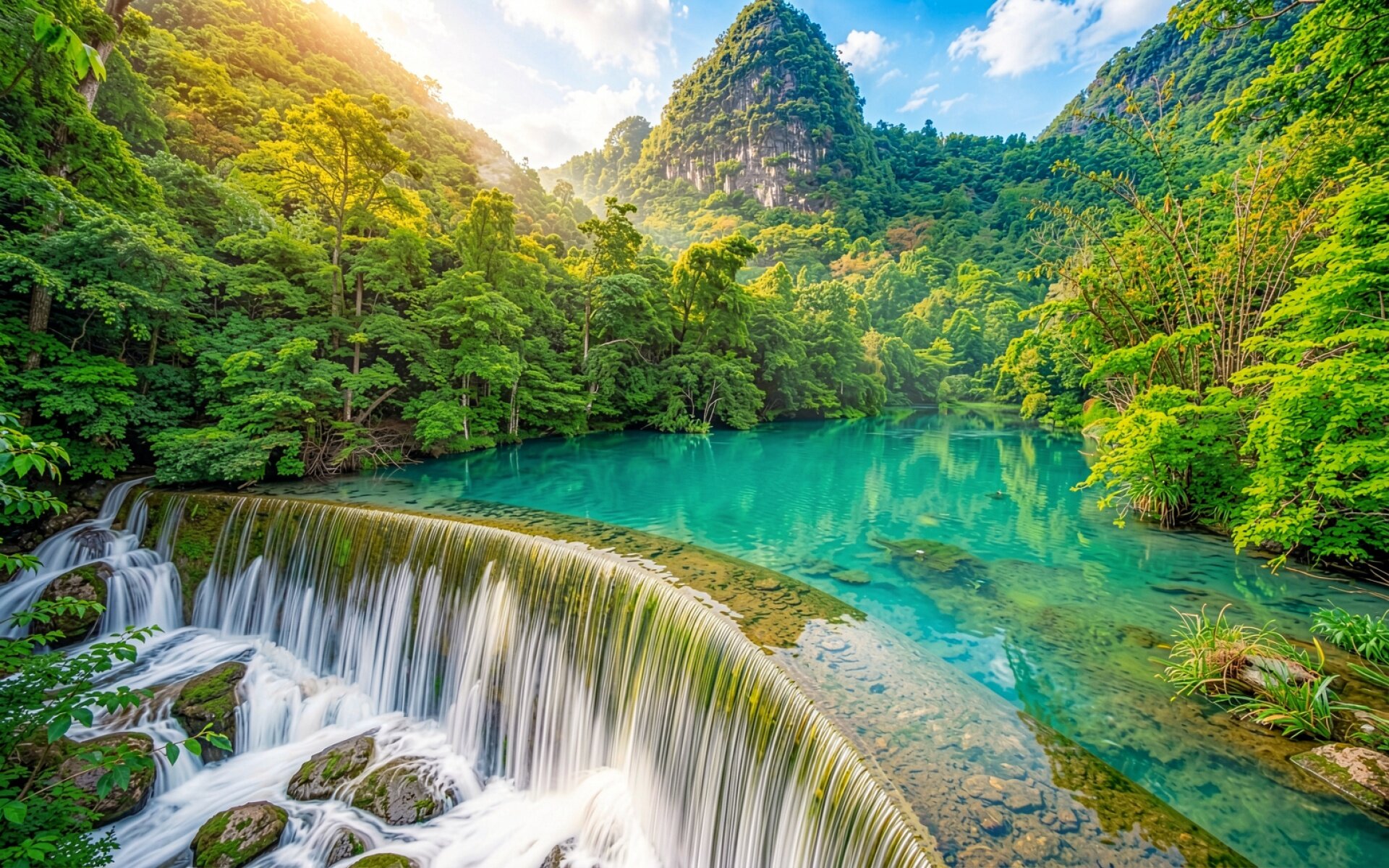 Изображение отличается высокой детализацией потоков воды, где создана мягкая текстура шелка. Освещение имитирует естественный солнечный свет, пробивающийся сквозь листву, что формирует плавные градиенты на поверхности бирюзовой воды и глубокие тени в гуще леса. Блики на мокрых камнях подчеркивают объем сцены. На сайте доступен удобный предпросмотр перед скачиванием, чтобы оценить качество на экране.