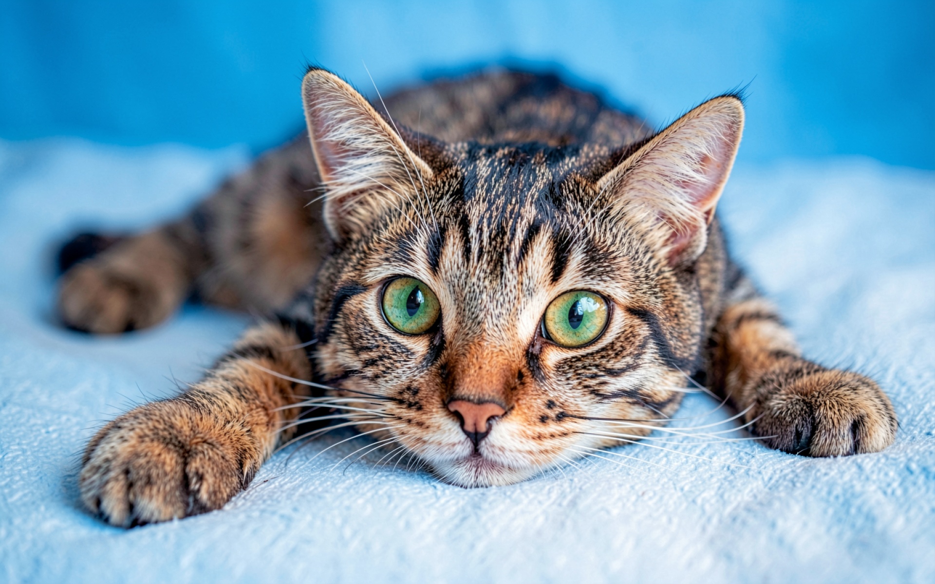 Заберите JPG-файл обоев «Полосатый кот с зелеными глазами на голубом фоне» на нашем сайте — и вот обоснование: файл оптимизирован для установки на рабочий стол и экран телефона.