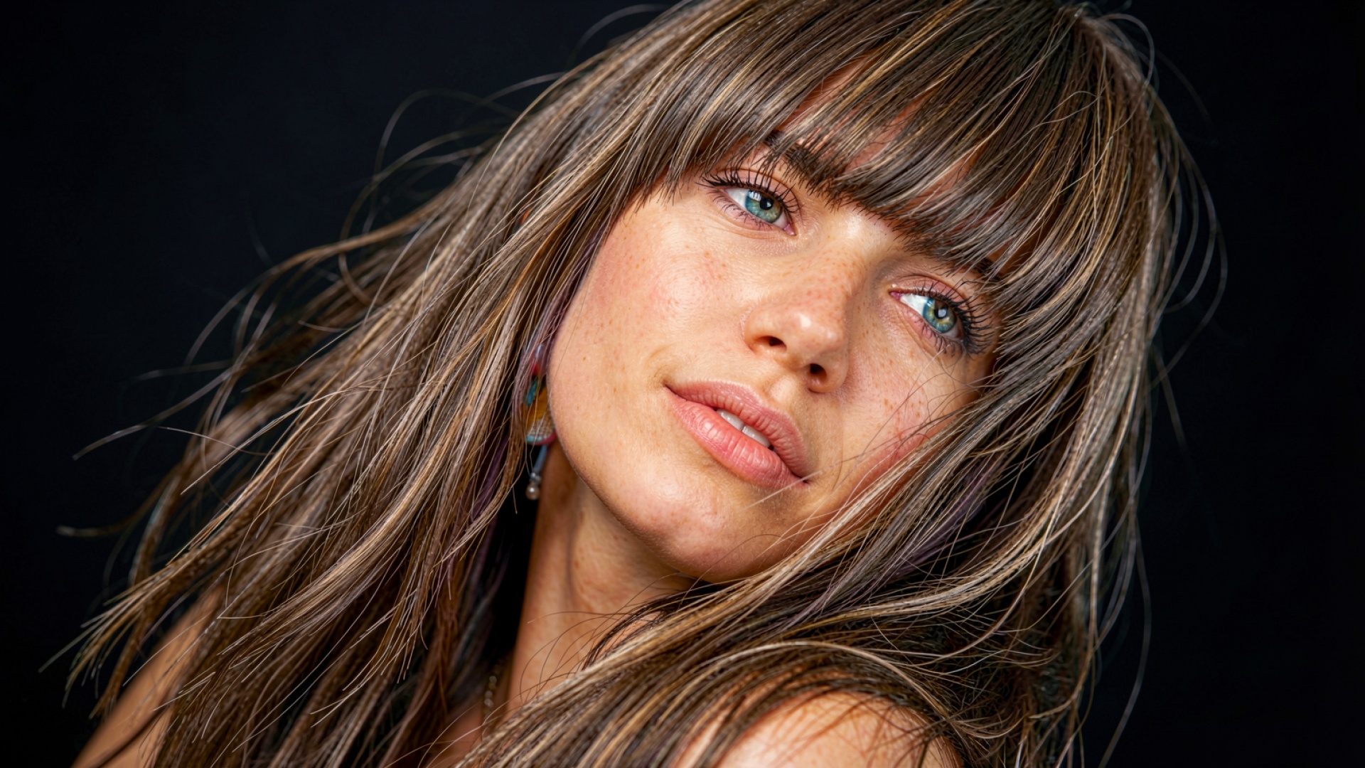 Изображение отличается высокой детализацией кожи, где четко прорисованы отдельные веснушки и поры. Контрастное освещение создает мягкие блики на радужке голубых глаз и подчеркивает текстуру прядей волос с тонкими градиентами коричневых оттенков. Глубокий черный фон исключает визуальный шум, акцентируя внимание на объеме лица и естественных тенях. На сайте реализован удобный предпросмотр перед скачиванием, чтобы оценить качество на экране.