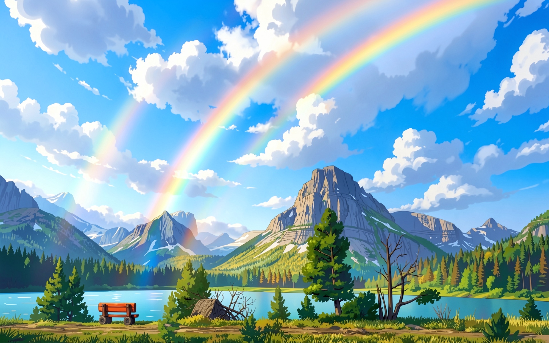 Двойная радуга над горным озером в стиле аниме обои