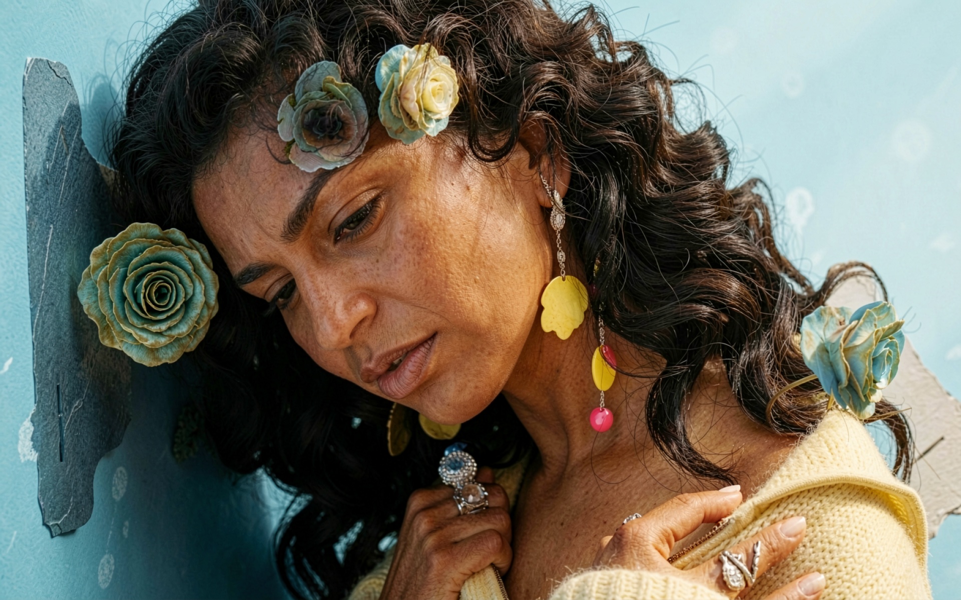 Изображение отличается высокой детализацией кожи и текстуры кудрявых волос. Мягкое боковое освещение создает естественные тени на лице и подчеркивает объем лепестков декоративных цветов. Градиенты голубого фона плавно переходят от насыщенных тонов к светлым участкам, создавая контраст с теплым оттенком желтого свитера. На сайте доступен удобный предпросмотр перед скачиванием, чтобы оценить качество на экране.