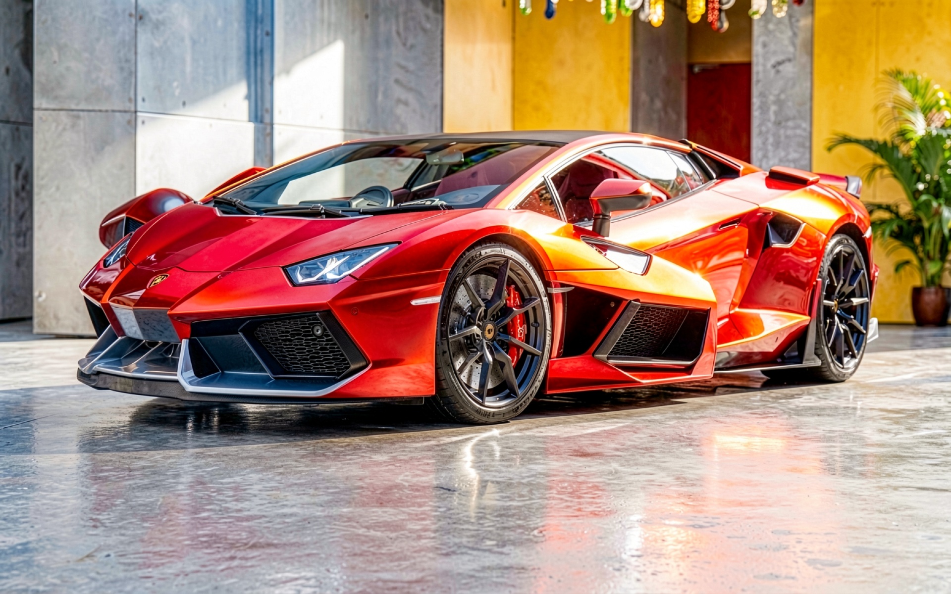 Скачивание JPG обоев «Красный суперкар Lamborghini Aventador в городском окружении» с нашего сайта нужно, потому что другие сайты обрезают края, а у нас полный кадр.