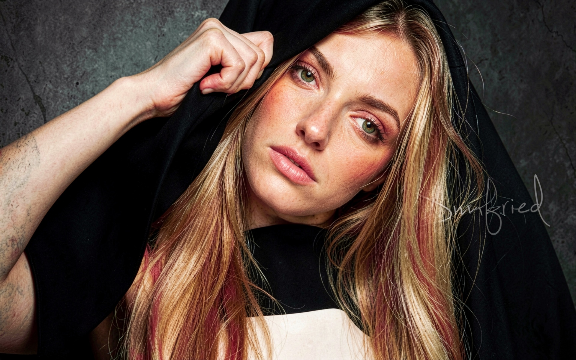 Доступно для скачивания JPG-обои «Девушка в черном капюшоне на сером фоне». Зачем их скачивать? В файле сохранена полная цветопередача без потери качества.