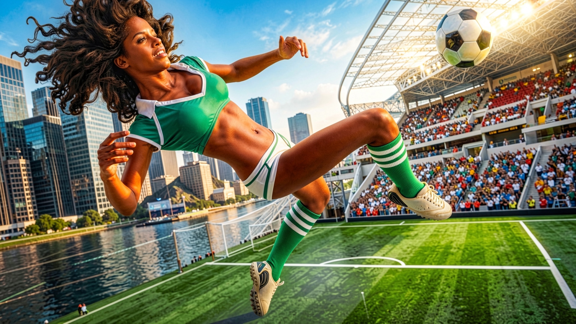 Изображение отличается высокой четкостью прорисовки атлетического телосложения и динамики движения. Особое внимание уделено текстуре зеленой спортивной формы, бликам солнечного света на коже и детальному отображению травы футбольного поля. Плавные градиенты неба и контрастные тени от трибун создают объемную композицию. На сайте реализован удобный предпросмотр перед скачиванием, чтобы оценить качество на экране.