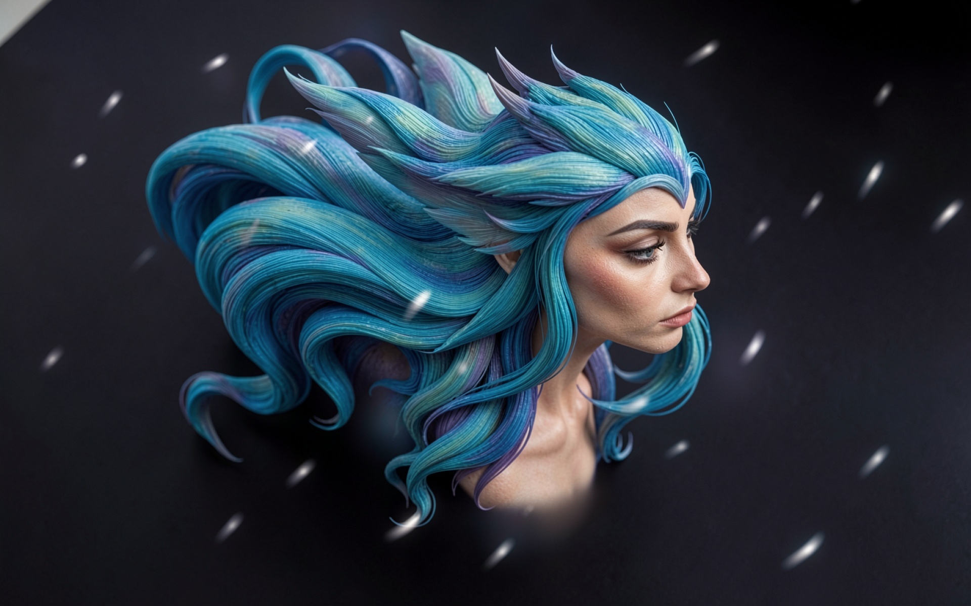 Техническое исполнение изображения акцентирует внимание на плавных градиентах синего и бирюзового оттенков в прядях волос. Освещение создает четкие блики на коже и волосах, формируя объемный контраст с глубоким темным фоном. Текстура кожи передана детально, а мягкие тени подчеркивают профиль персонажа. Перед скачиванием доступен удобный предпросмотр, позволяющий оценить чистоту цветовых переходов на вашем экране.