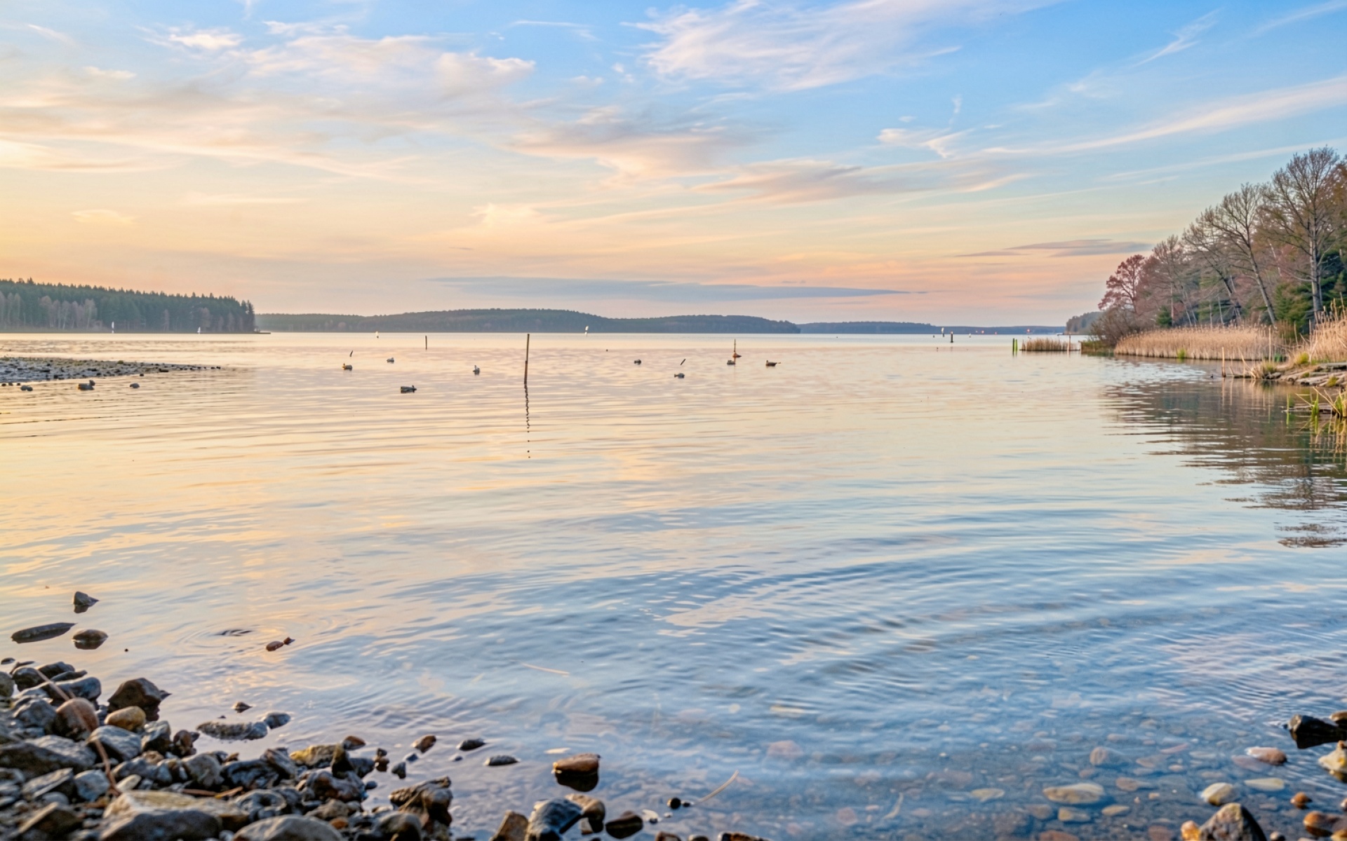 Изображение передает мягкие градиенты неба и зеркальную поверхность воды. Особое внимание уделено текстуре прибрежной гальки на переднем плане, где четко видны блики и глубокие тени между камнями. Освещение создает теплый золотистый контур вдоль линии леса и камышей, подчеркивая объем ландшафта. На сайте доступен удобный предпросмотр перед скачиванием для оценки качества на экране
