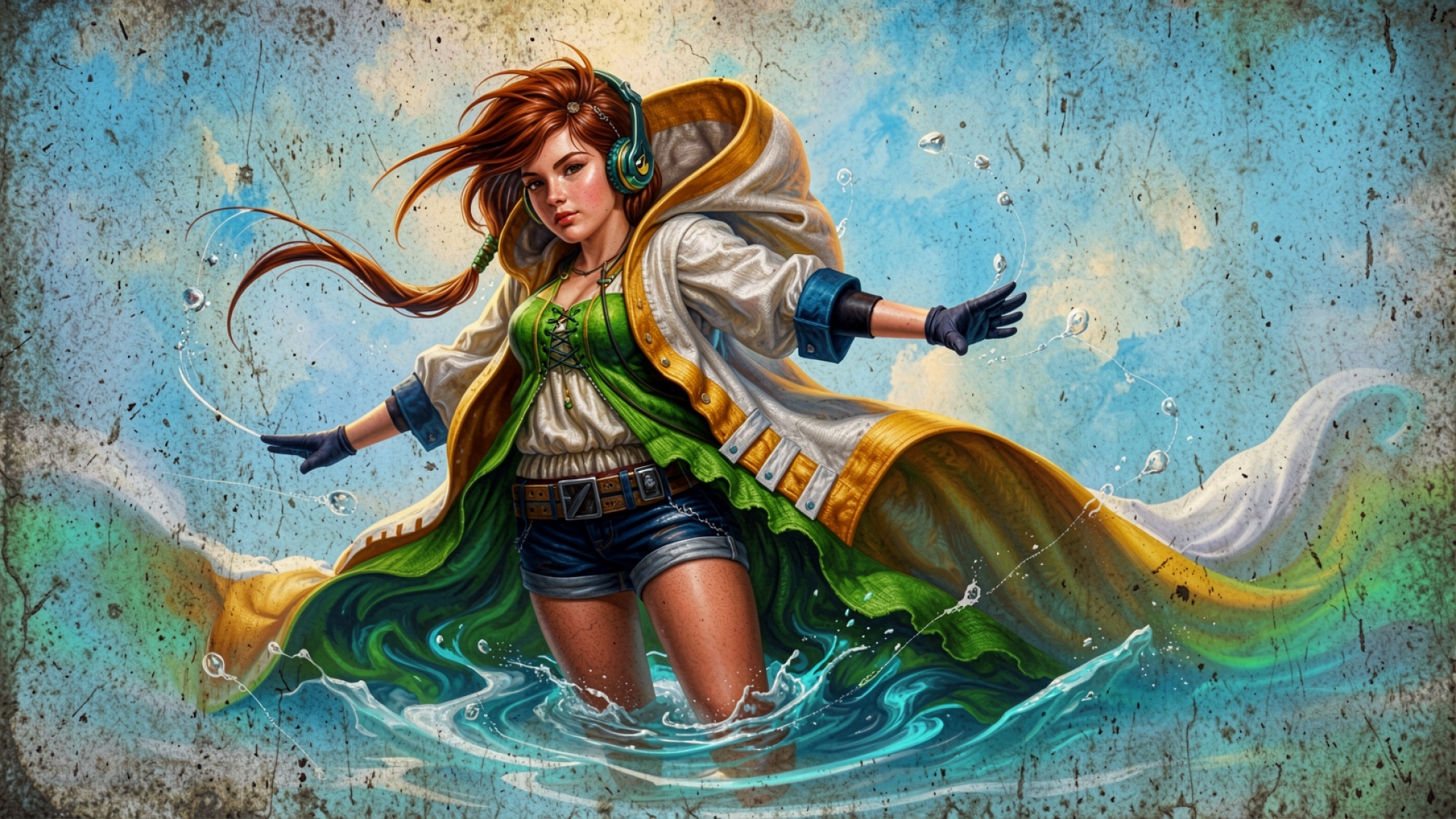 Изображение отличается детальной проработкой текстуры ткани плаща и глянцевого пластика наушников. Освещение создает мягкие блики на поверхности воды, а градиенты фона плавно переходят от небесно-голубого к охристым тонам по краям. Контрастные тени подчеркивают объем фигуры и динамику брызг вокруг персонажа. На сайте доступен удобный предпросмотр перед скачиванием для оценки качества на вашем экране