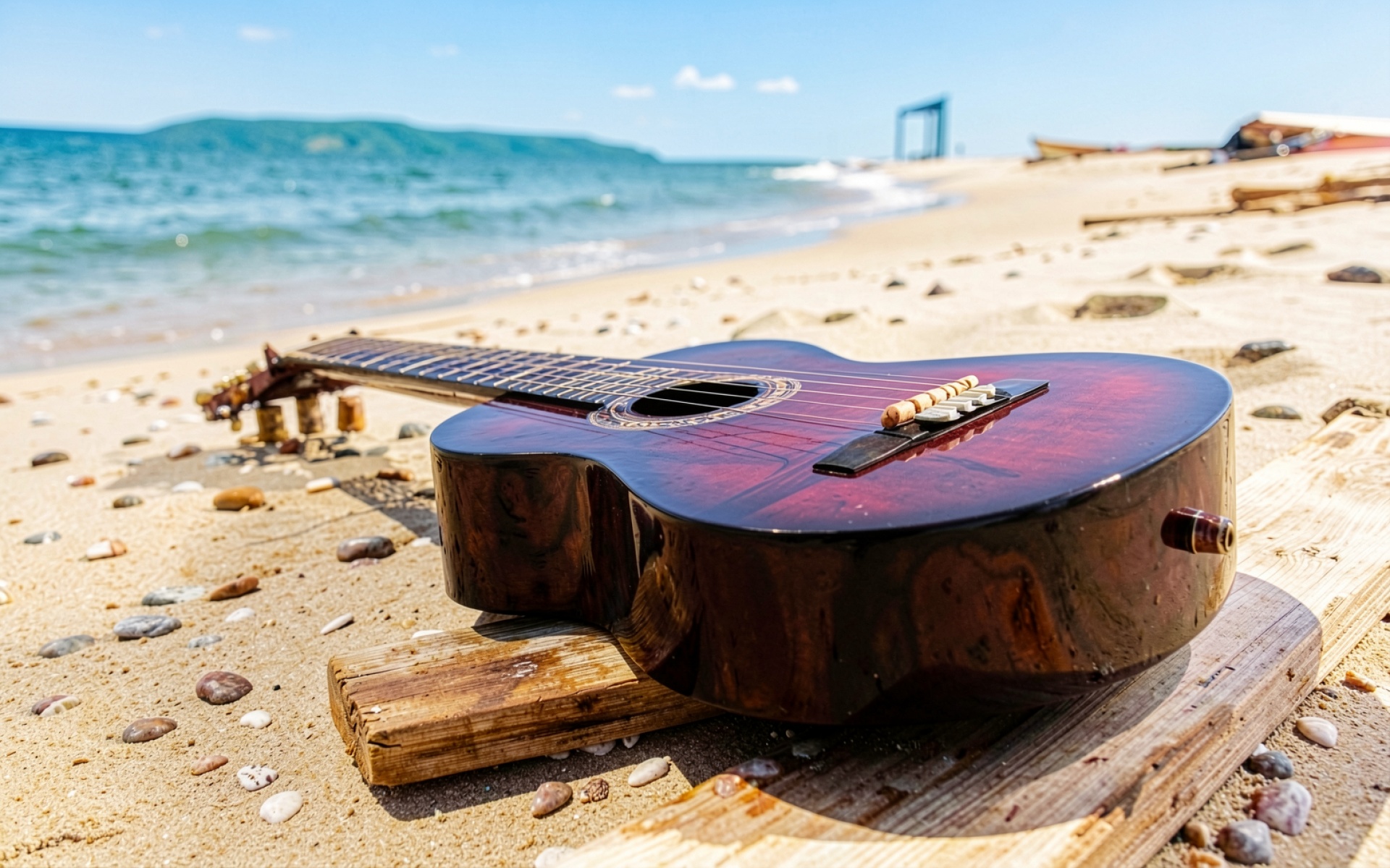 Изображение детально передает глянцевую текстуру лакированного дерева корпуса инструмента и контраст между темным деревом и светлым песком. Освещение имитирует яркий полуденный свет, создавая четкие тени под корпусом гитары и выраженные блики на ее поверхности. Градиенты голубого неба и морской воды плавно переходят в теплые бежевые тона береговой линии. На сайте доступен удобный предпросмотр перед скачиванием для оценки качества на экране.
