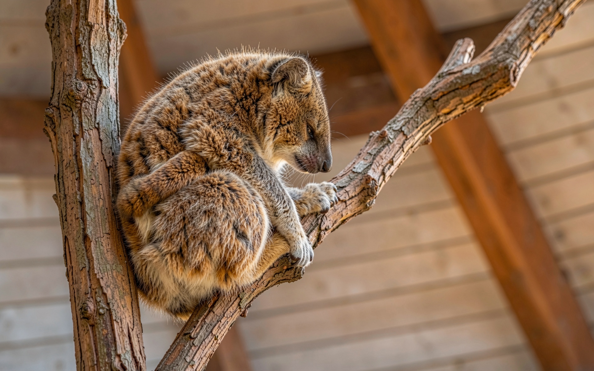 Изображение детально передает грубую текстуру шерсти животного и шероховатость древесной коры. Мягкое естественное освещение создает плавные переходы теней в складках тела гиены, подчеркивая объем фигуры на фоне светлых деревянных конструкций вольера. Градиенты заднего плана плавно уводят взгляд в расфокус, акцентируя внимание на центральном объекте. На сайте доступен удобный предпросмотр перед скачиванием для оценки качества отображения на вашем экране
