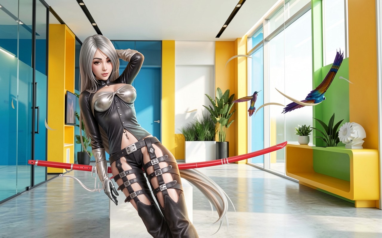 Техническое исполнение кадра акцентирует внимание на глянцевой текстуре костюма и четких бликах от офисного освещения. Контраст между глубоким черным цветом латекса и ярко-красным лезвием меча создает динамический центр композиции. Мягкие градиенты на заднем плане и детальная проработка теней в складках одежды добавляют объему. На сайте предусмотрен удобный предпросмотр перед загрузкой, чтобы оценить качество отображения на вашем экране
