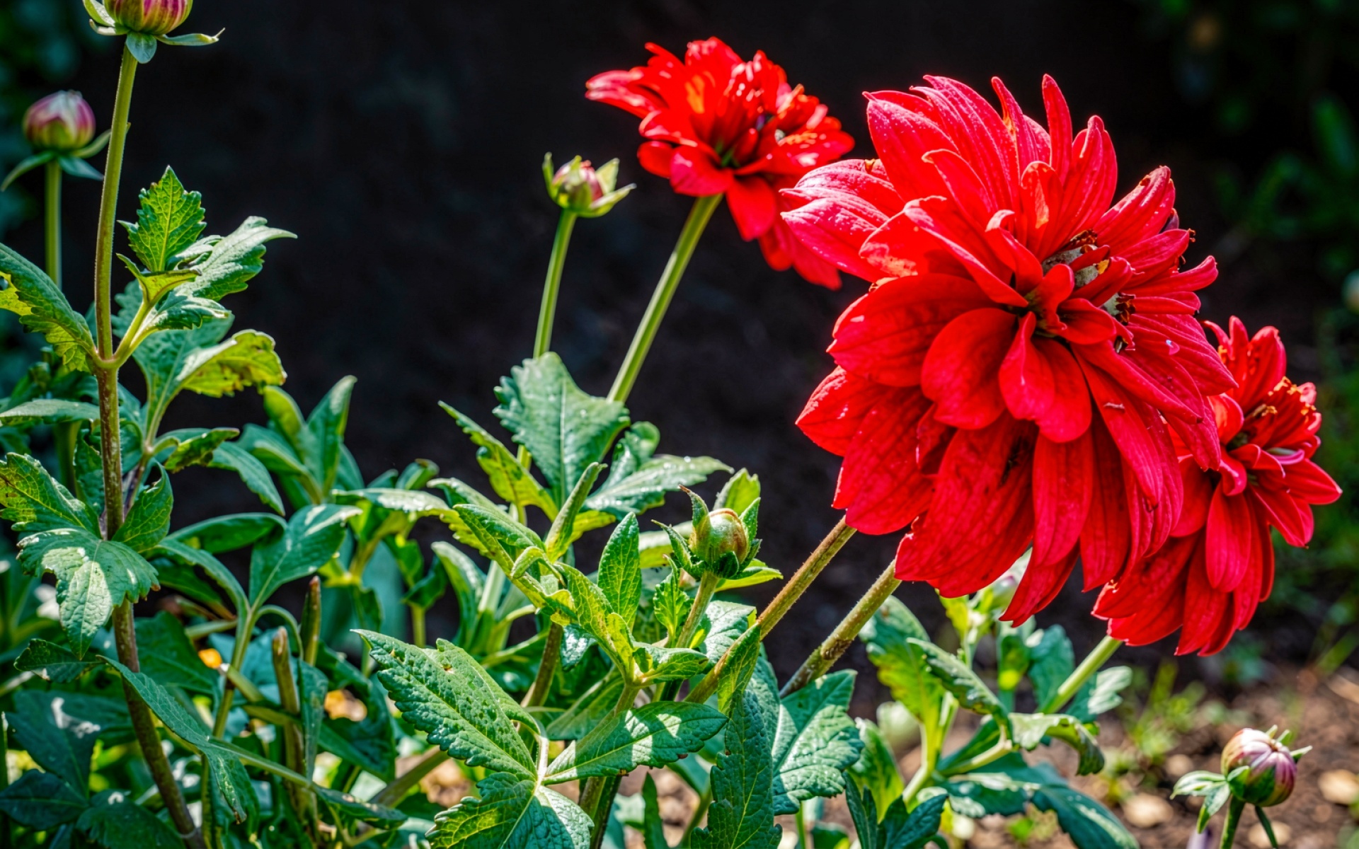 Красные георгины в темном садовом окружении обои