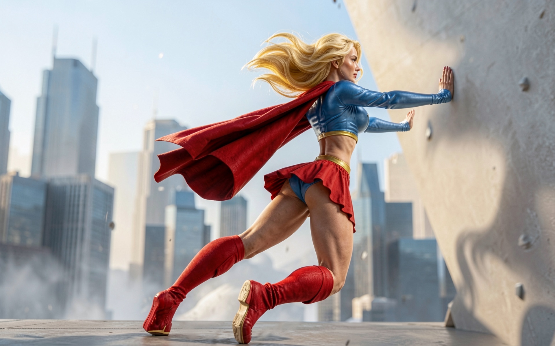 Изображение отличается детальной проработкой текстуры латексного костюма и матовой поверхности бетонной стены. Освещение имитирует яркий дневной свет, создавая четкие блики на плечах героини и глубокие тени в складках красного плаща. Градиенты фона плавно переходят от светло-голубого неба к серым силуэтам городских небоскребов. На сайте доступен удобный предпросмотр перед загрузкой для оценки качества отображения на экране